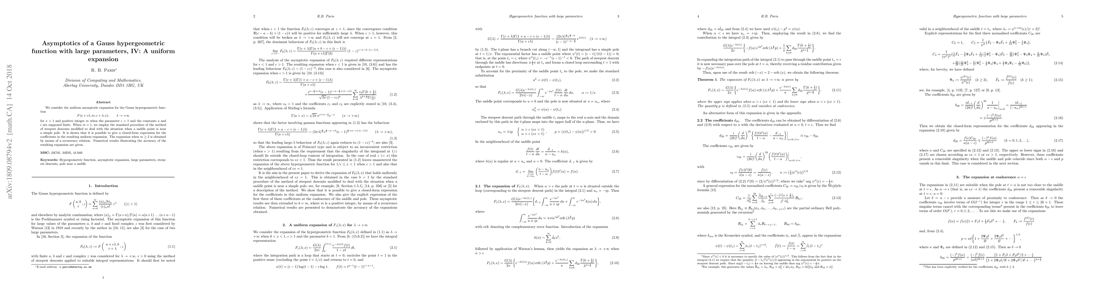 This paper provides a uniform asymptotic expansion for the Gauss hypergeometric function \(F(a+\epsilon\lambda,m;c+\lambda;x)\) as \(\lambda\) approaches infinity, focusing on cases where \(x<1\), \(m\) is a positive integer, and \(\epsilon>1\). The method of steepest descents is used for \(m=1\), and a recurrence relation is derived for \(m\geq 2\), with numerical results demonstrating the expansion's accuracy.