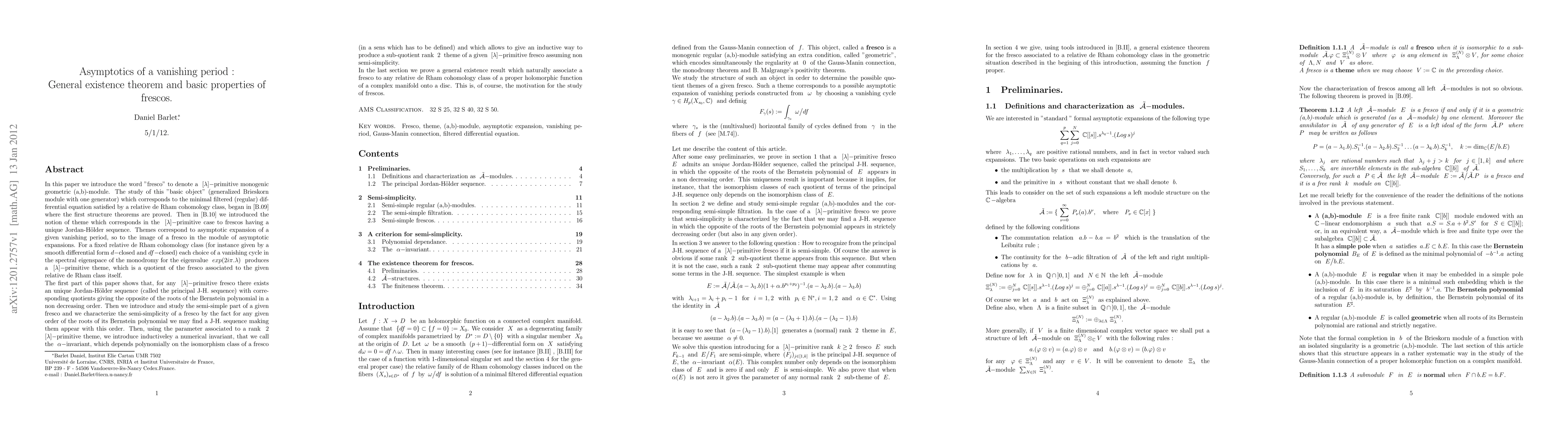 In this paper we introduce the word "fresco" to denote a \ $[\lambda]-$primitive monogenic geometric (a,b)-module. The study of this "basic object" (generalized Brieskorn module with one generator) which corresponds to the minimal filtered (regular) differential equation satisfied by a relative de Rham cohomology class, began in [B.09] where the first structure theorems are proved. Then in [B.10] we introduced the notion of theme which corresponds in the \ $[\lambda]-$primitive case to frescos having a unique Jordan-H{\"o}lder sequence. Themes correspond to asymptotic expansion of a given vanishing period, so to the image of a fresco in the module of asymptotic expansions. For a fixed relative de Rham cohomology class (for instance given by a smooth differential form $d-$closed and $df-$closed) each choice of a vanishing cycle in the spectral eigenspace of the monodromy for the eigenvalue \ $exp(2i\pi.\lambda)$ \ produces a \ $[\lambda]-$primitive theme, which is a quotient of the fresco associated to the given relative de Rham class itself. The first part of this paper shows that, for any \ $[\lambda]-$primitive fresco there exists an unique Jordan-H{\"o}lder sequence (called the principal J-H. sequence) with corresponding quotients giving the opposite of the roots of the Bernstein polynomial in a non decreasing order. Then we introduce and study the semi-simple part of a given fresco and we characterize the semi-simplicity of a fresco by the fact for any given order of the roots of its Bernstein polynomial we may find a J-H. sequence making them appear with this order. Then, using the parameter associated to a rank \ 2 \ \ $[\lambda]-$primitive theme, we introduce inductiveley a numerical invariant, that we call the \ $\alpha-$invariant, which depends polynomially on the isomorphism class of a fresco (in a sens which has to be defined) and which allows to give an inductive way to produce a sub-quotient rank \ 2 \ theme of a given \ $[\lambda]-$primitive fresco assuming non semi-simplicity. In the last section we prove a general existence result which naturally associate a fresco to any relative de Rham cohomology class of a proper holomorphic function of a complex manifold onto a disc. This is, of course, the motivation for the study of frescos.