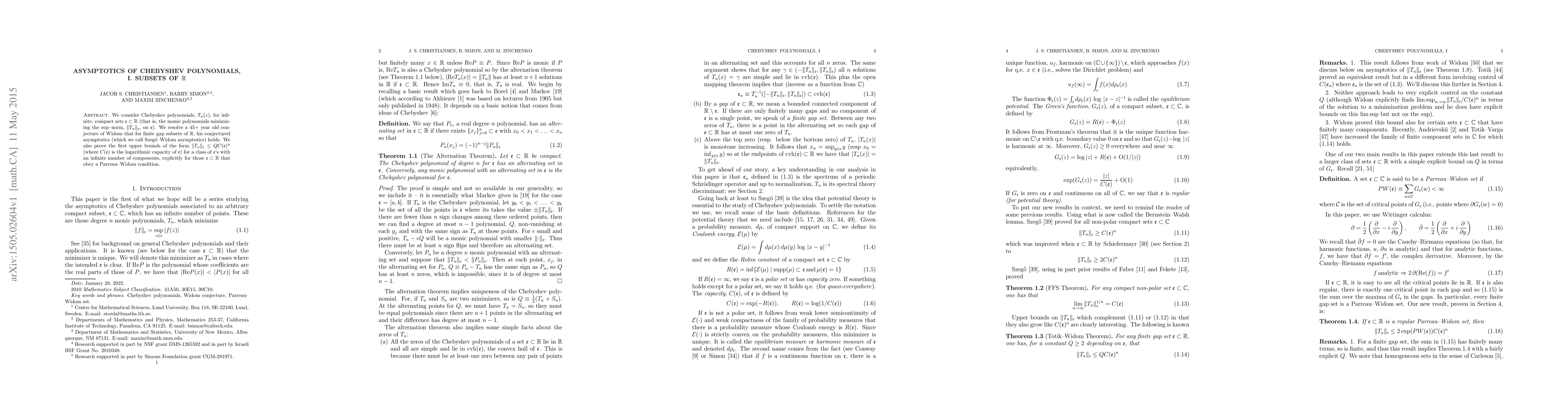 This paper resolves a longstanding conjecture regarding the asymptotics of Chebyshev polynomials on infinite, compact subsets of $\mathbb{R}$, proving the Szegő-Widom asymptotics for finite gap sets and establishing upper bounds for the norm of these polynomials for subsets satisfying a Parreau-Widom condition.