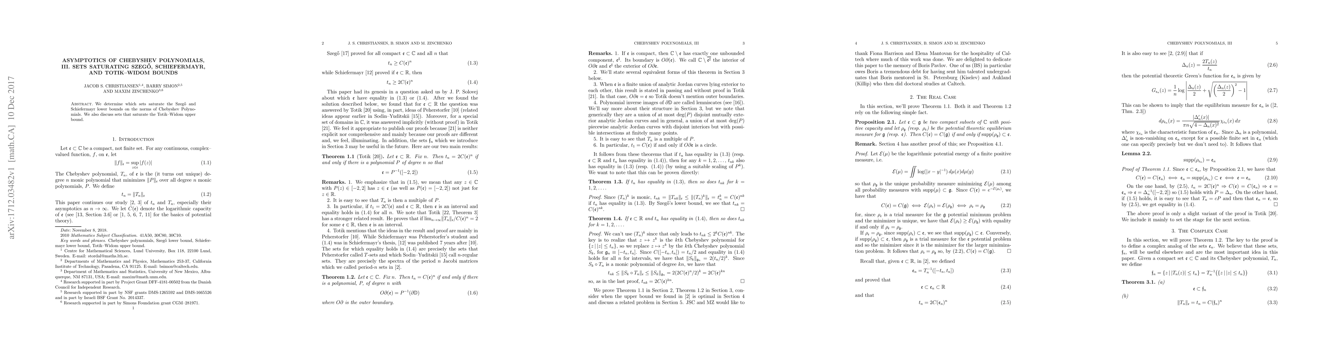 We determine which sets saturate the Szeg}o and Schiefermayr lower bounds on the norms of Chebyshev Polynomials. We also discuss sets that saturate the Totik--Widom upper bound.
