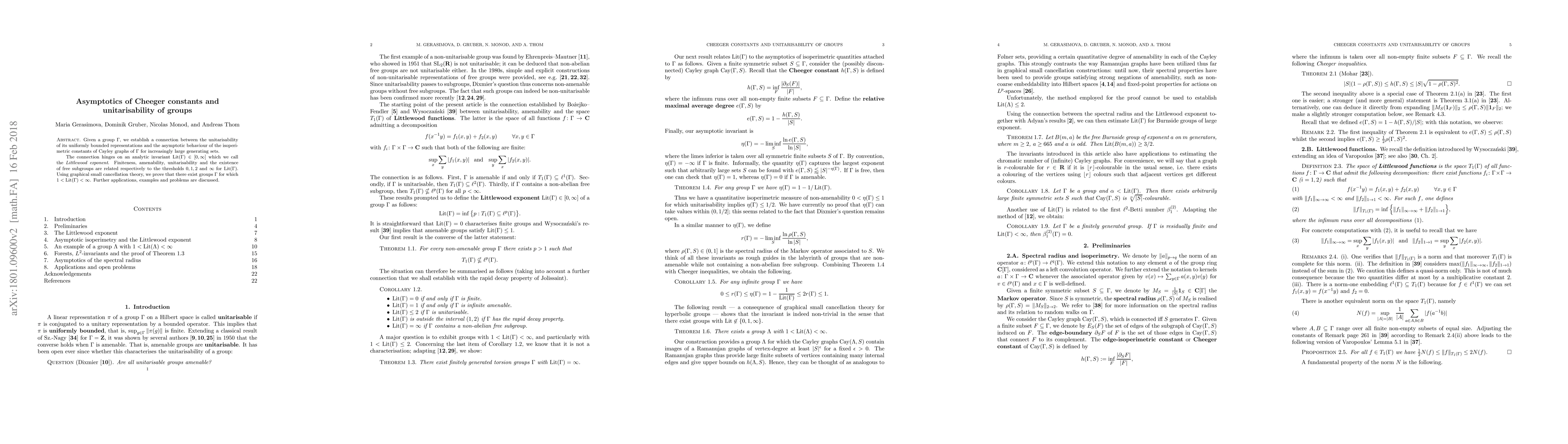 Given a group $\Gamma$, we establish a connection between the unitarisability of its uniformly bounded representations and the asymptotic behaviour of the isoperimetric constants of Cayley graphs of $\Gamma$ for increasingly large generating sets. The connection hinges on an analytic invariant ${\rm Lit}(\Gamma)\in [0, \infty]$ which we call the \emph{Littlewood exponent}. Finiteness, amenability, unitarisability and the existence of free subgroups are related respectively to the thresholds $0, 1, 2$ and $\infty$ for ${\rm Lit}(\Gamma)$. Using graphical small cancellation theory, we prove that there exist groups $\Gamma$ for which $1<{\rm Lit}(\Gamma)<\infty$. Further applications, examples and problems are discussed.