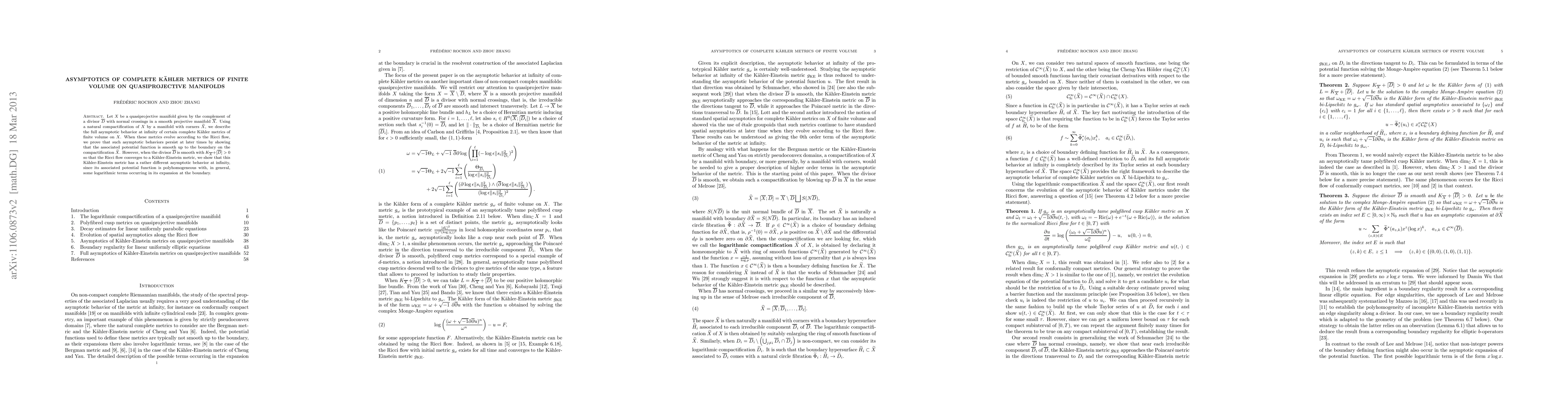 Let X be a quasiprojective manifold given by the complement of a divisor $\bD$ with normal crossings in a smooth projective manifold $\bX$. Using a natural compactification of $X$ by a manifold with corners $\tX$, we describe the full asymptotic behavior at infinity of certain complete Kahler metrics of finite volume on X. When these metrics evolve according to the Ricci flow, we prove that such asymptotic behaviors persist at later time by showing the associated potential function is smooth up to the boundary on the compactification $\tX$. However, when the divisor $\bD$ is smooth with $K_{\bX}+[\bD]>0$ and the Ricci flow converges to a Kahler-Einstein metric, we show that this Kahler-Einstein metric has a rather different asymptotic behavior at infinity, since its associated potential function is polyhomogeneous with in general some logarithmic terms occurring in its expansion at the boundary.