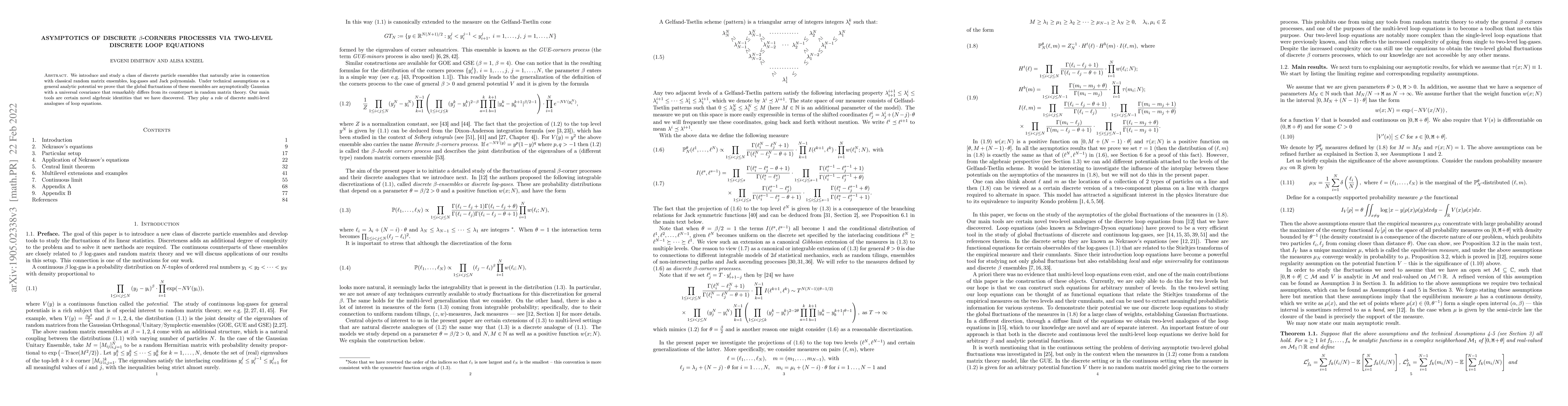 We introduce and study a class of discrete particle ensembles that naturally arise in connection with classical random matrix ensembles, log-gases and Jack polynomials. Under technical assumptions on a general analytic potential we prove that the global fluctuations of these ensembles are asymptotically Gaussian with a universal covariance that remarkably differs from its counterpart in random matrix theory. Our main tools are certain novel algebraic identities that we have discovered. They play a role of discrete multi-level analogues of loop equations.