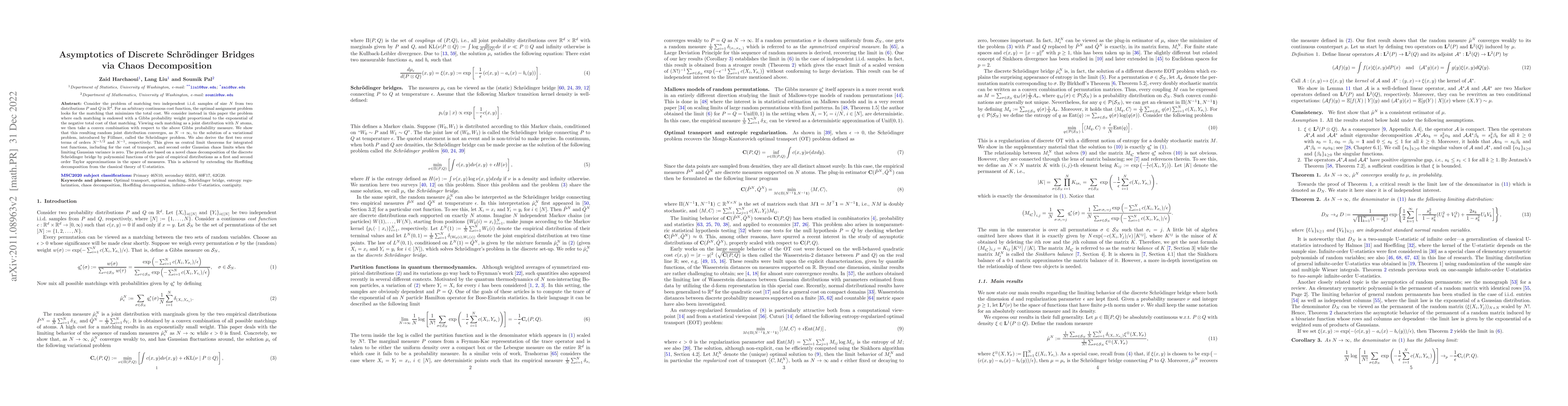 Consider the problem of matching two independent i.i.d. samples of size $N$ from two distributions $P$ and $Q$ in $\mathbb{R}^d$. For an arbitrary continuous cost function, the optimal assignment problem looks for the matching that minimizes the total cost. We consider instead in this paper the problem where each matching is endowed with a Gibbs probability weight proportional to the exponential of the negative total cost of that matching. Viewing each matching as a joint distribution with $N$ atoms, we then take a convex combination with respect to the above Gibbs probability measure. We show that this resulting random joint distribution converges, as $N\rightarrow \infty$, to the solution of a variational problem, introduced by F\"ollmer, called the Schr\"odinger problem. We also derive the first two error terms of orders $N^{-1/2}$ and $N^{-1}$, respectively. This gives us central limit theorems for integrated test functions, including for the cost of transport, and second order Gaussian chaos limits when the limiting Gaussian variance is zero. The proofs are based on a novel chaos decomposition of the discrete Schr\"odinger bridge by polynomial functions of the pair of empirical distributions as the first and second order Taylor approximations in the space of measures. This is achieved by extending the Hoeffding decomposition from the classical theory of U-statistics.