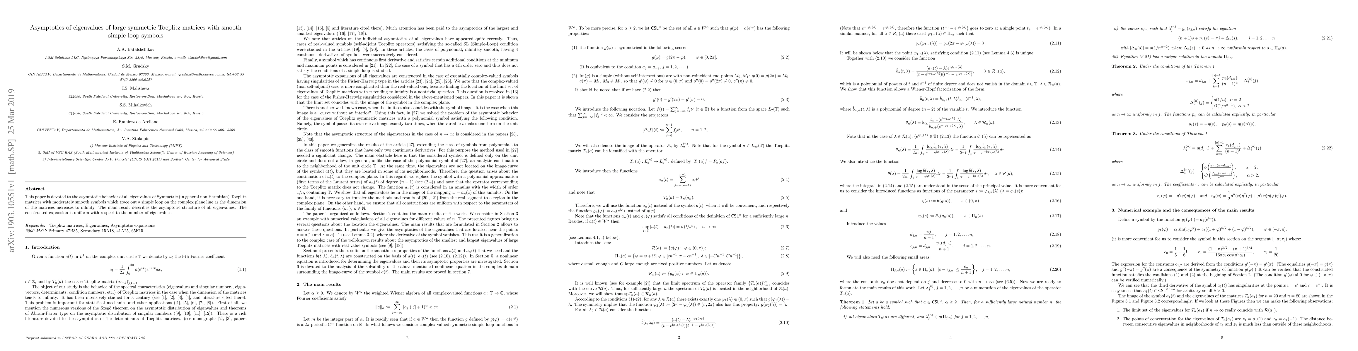 This paper is devoted to the asymptotic behavior of all eigenvalues of Symmetric (in general non Hermitian) Toeplitz matrices with moderately smooth symbols which trace out a simple loop on the complex plane line as the dimension of the matrices increases to infinity. The main result describes the asymptotic structure of all eigenvalues. The constructed expansion is uniform with respect to the number of eigenvalues. Keywords: Toeplitz matrices, eigenvalues, asymptotic expansions