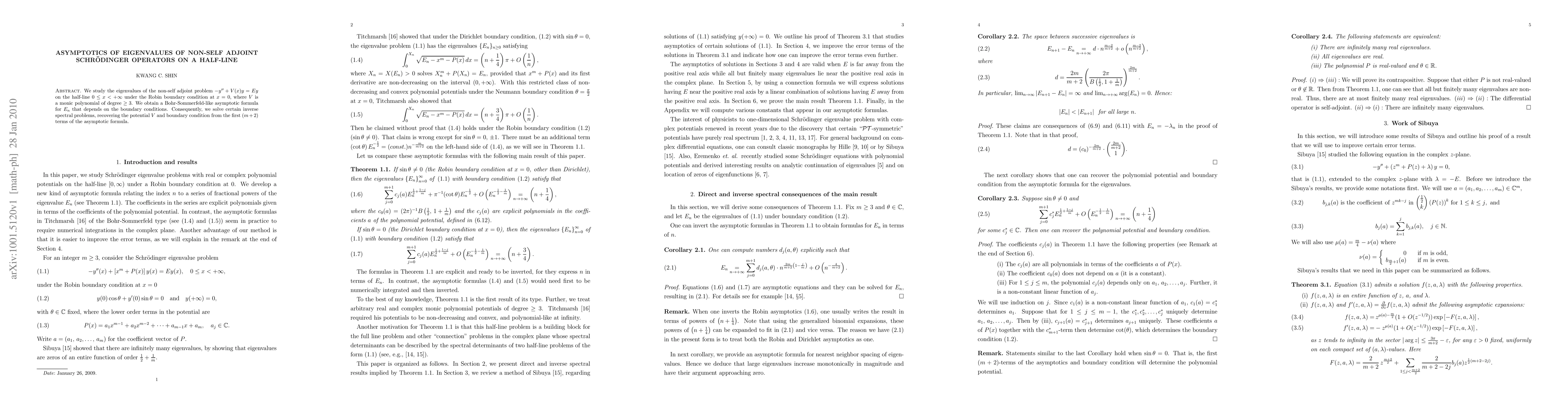 We study the eigenvalues of the non-self adjoint problem $-y^{\prime\prime}+V(x)y=E y$ on the half-line $0\leq x<+\infty$ under the Robin boundary condition at $x=0$, where $V$ is a monic polynomial of degree $\geq 3$. We obtain a Bohr-Sommerfeld-like asymptotic formula for $E_n$ that depends on the boundary conditions. Consequently, we solve certain inverse spectral problems, recovering the potential $V$ and boundary condition from the first $(m+2)$ terms of the asymptotic formula.