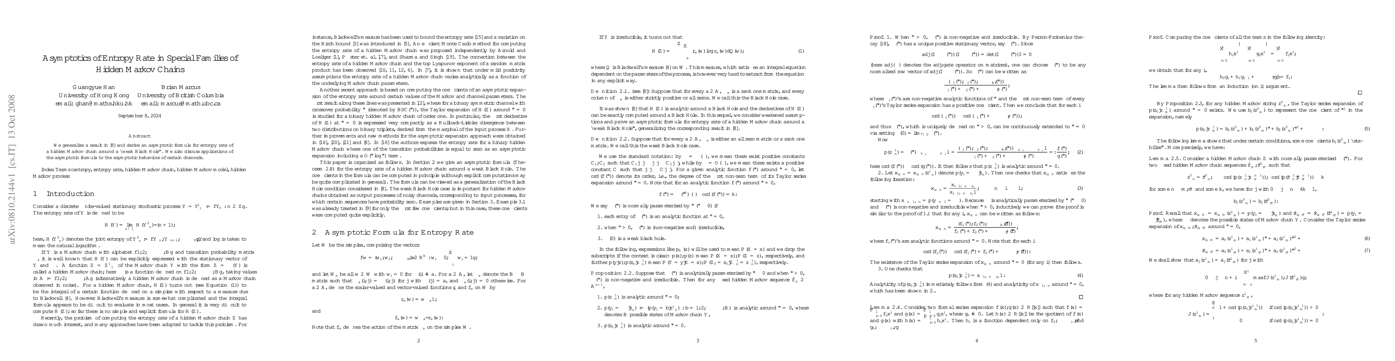 We derive an asymptotic formula for entropy rate of a hidden Markov chain around a "weak Black Hole". We also discuss applications of the asymptotic formula to the asymptotic behaviors of certain channels.