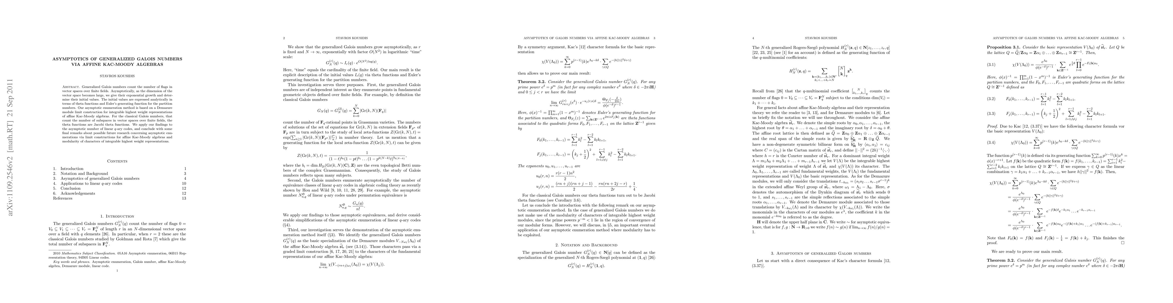 Generalized Galois numbers count the number of flags in vector spaces over finite fields. Asymptotically, as the dimension of the vector space becomes large, we give their exponential growth and determine their initial values. The initial values are expressed analytically in terms of theta functions and Euler's generating function for the partition numbers. Our asymptotic enumeration method is based on a Demazure module limit construction for integrable highest weight representations of affine Kac-Moody algebras. For the classical Galois numbers, that count the number of subspaces in vector spaces over finite fields, the theta functions are Jacobi theta functions. We apply our findings to the asymptotic number of q-ary codes, and conclude with some final remarks about possible future research concerning asymptotic enumerations via limit constructions for affine Kac-Moody algebras.
