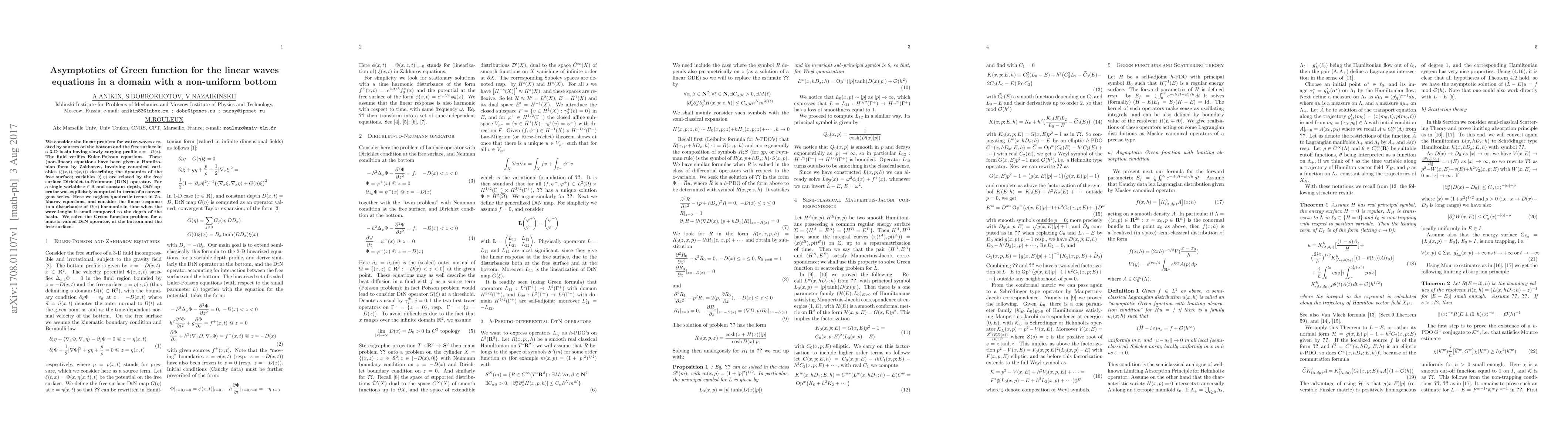 We consider the linear problem for water-waves created by sources on the bottom and the free surface in a 3-D basin having slowly varying profile $z=-D(x)$. The fluid verifies Euler-Poisson equations. These (non-linear) equations have been given a Hamiltonian form by Zakharov, involving canonical variables $(\xi(x,t),\eta(x,t))$ describing the dynamics of the free surface; variables $(\xi,\eta)$ are related by the free surface Dirichlet-to-Neumann (DtN) operator. For a single variable $x\in{\bf R}$ and constant depth, DtN operator was explicitely computed in terms of a convergent series. Here we neglect quadratic terms in Zakharov equations, and consider the linear response to a disturbance of $D(x)$ harmonic in time when the wave-lenght is small compared to the depth of the basin. We solve the Green function problem for a matrix-valued DtN operator, at the bottom and the free-surface.