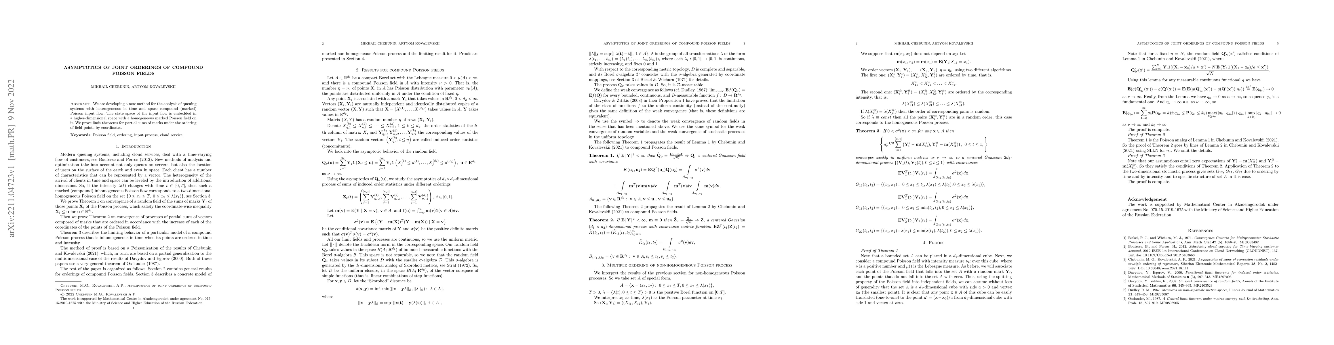 This paper introduces a new method for analyzing queuing systems with marked Poisson input flows, proving limit theorems for partial sums of marks ordered by field point coordinates in a higher-dimensional space. The focus is on the asymptotic behavior of joint orderings of these compound Poisson fields.