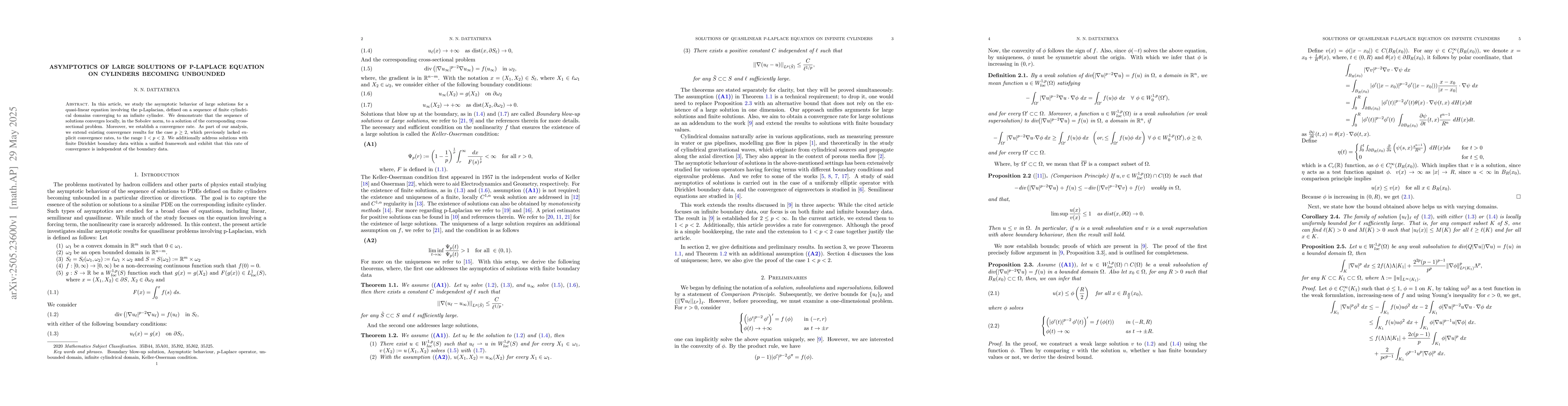 This paper studies the behavior of large solutions to a p-Laplace equation on cylinders as they become unbounded, demonstrating local convergence in Sobolev norm to a solution of the cross-sectional problem with an established convergence rate.