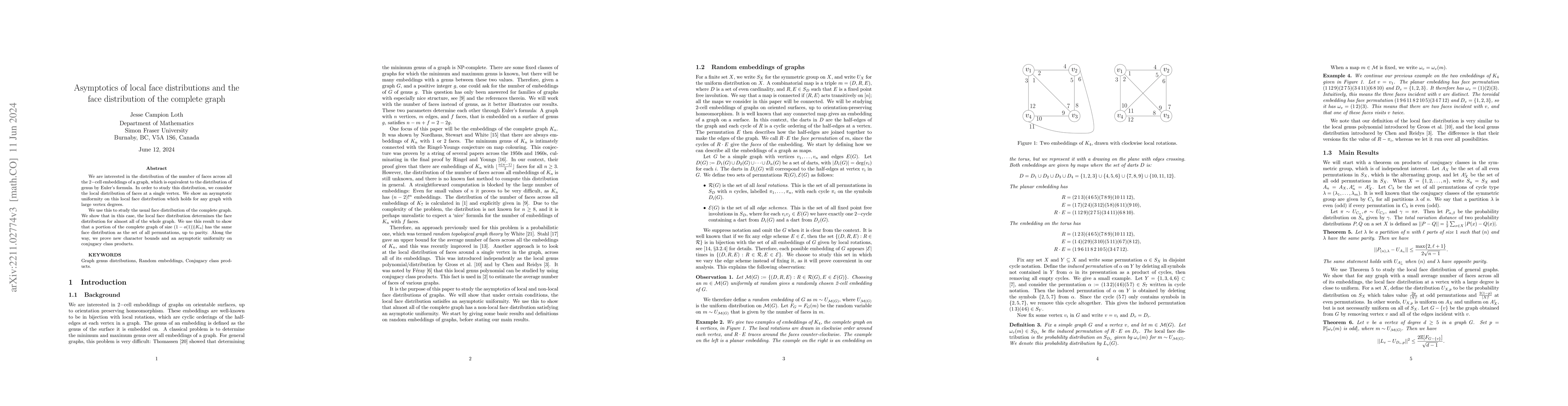 We are interested in the distribution of the number of faces across all the $2-$cell embeddings of a graph, which is equivalent to the distribution of genus by Euler's formula. In order to study this distribution, we consider the local distribution of faces at a single vertex. We show an asymptotic uniformity on this local face distribution which holds for any graph with large vertex degrees. We use this to study the usual face distribution of the complete graph. We show that in this case, the local face distribution determines the face distribution for almost all of the whole graph. We use this result to show that a portion of the complete graph of size $(1-o(1))|K_n|$ has the same face distribution as the set of all permutations, up to parity. Along the way, we prove new character bounds and an asymptotic uniformity on conjugacy class products.