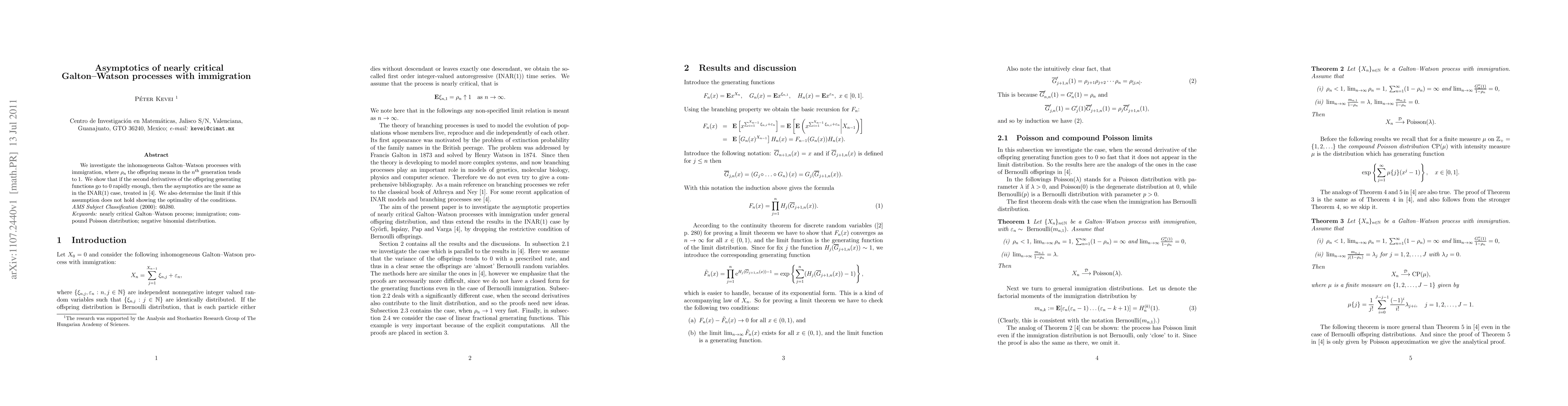 This paper investigates asymptotics of nearly critical Galton-Watson processes with immigration, showing optimal conditions for similarity to the INAR(1) case and determining limits under different assumptions.
