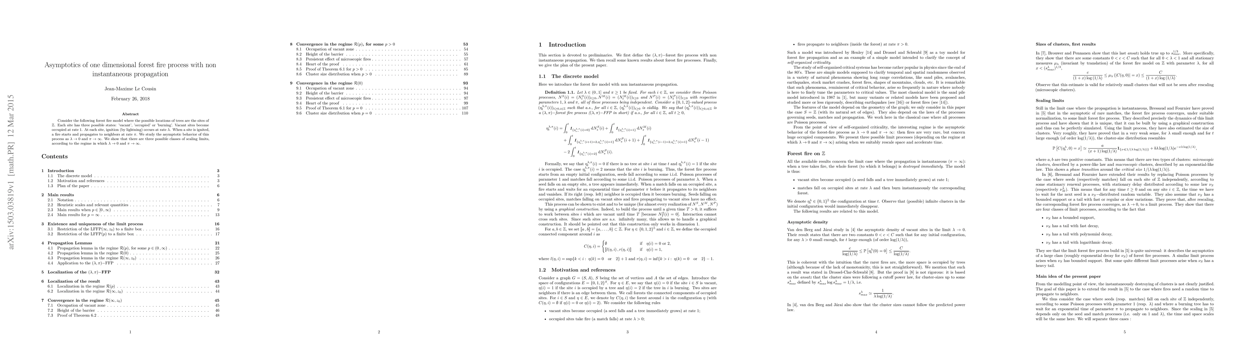 Consider the following forest fire model where the possible locations of trees are the sites of $\mathbb{Z}$. Each site has three possible states: 'vacant', 'occupied' or 'burning'. Vacant sites become occupied at rate $1$. At each site, ignition (by lightning) occurs at rate $\lambda$. When a site is ignited, a fire starts and propagates to neighbors at rate $\pi$. We study the asymptotic behavior of this process as $\lambda\to0$ and $\pi\to\infty$. We show that there are three possible classes of scaling limits, according to the regime in which $\lambda\to0$ and $\pi\to\infty$.