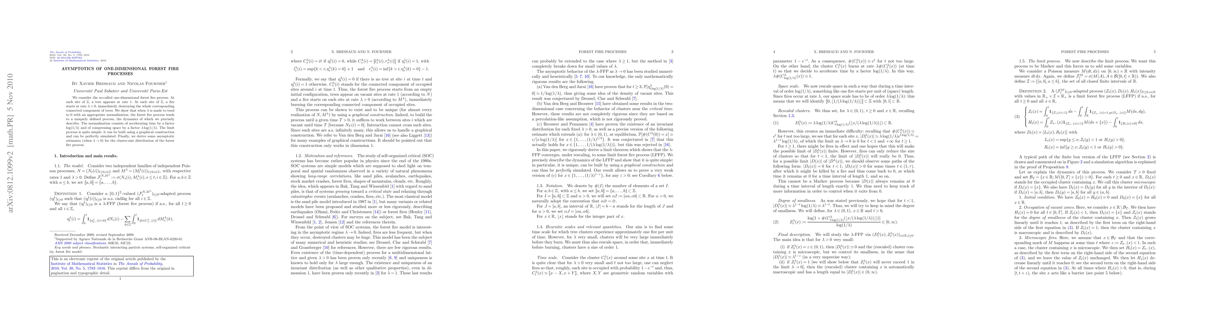 We consider the so-called one-dimensional forest fire process. At each site of $\mathbb{Z}$, a tree appears at rate $1$. At each site of $\mathbb{Z}$, a fire starts at rate ${\lambda}>0$, immediately destroying the whole corresponding connected component of trees. We show that when ${\lambda}$ is made to tend to $0$ with an appropriate normalization, the forest fire process tends to a uniquely defined process, the dynamics of which we precisely describe. The normalization consists of accelerating time by a factor $\log(1/{\lambda})$ and of compressing space by a factor ${\lambda}\log(1/{\lambda})$. The limit process is quite simple: it can be built using a graphical construction and can be perfectly simulated. Finally, we derive some asymptotic estimates (when ${\lambda}\to0$) for the cluster-size distribution of the forest fire process.