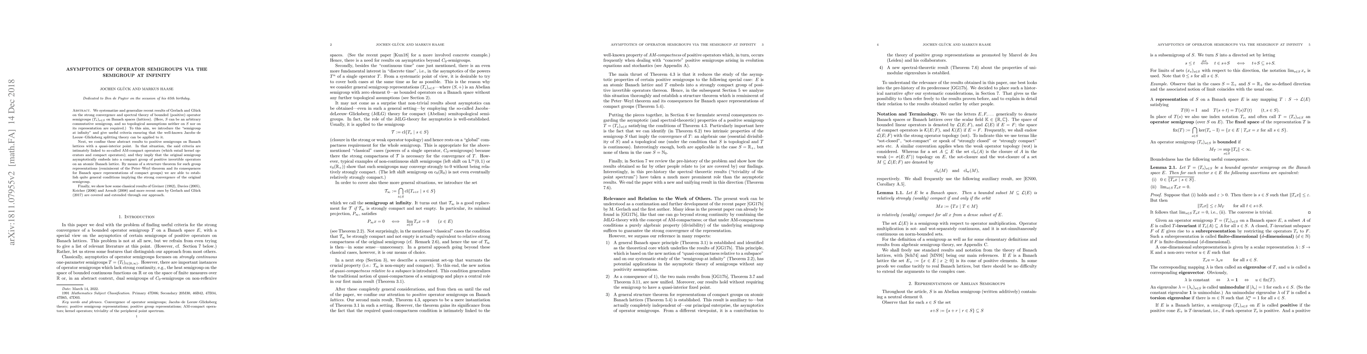 We systematize and generalize recent results of Gerlach and Gl\"uck on the strong convergence and spectral theory of bounded (positive) operator semigroups $(T_s)_{s\in S}$ on Banach spaces (lattices). (Here, $S$ can be an arbitrary commutative semigroup, and no topological assumptions neither on $S$ nor on its representation are required.) To this aim, we introduce the "semigroup at infinity" and give useful criteria ensuring that the well-known Jacobs--de Leeuw--Glicksberg splitting theory can be applied to it. Next, we confine these abstract results to positive semigroups on Banach lattices with a quasi-interior point. In that situation, the said criteria are intimately linked to so-called AM-compact operators (which entail kernel operators and compact operators); and they imply that the original semigroup asymptotically embeds into a compact group of positive invertible operators on an atomic Banach lattice. By means of a structure theorem for such group representations (reminiscent of the Peter--Weyl theorem and its consequences for Banach space representations of compact groups) we are able to establish quite general conditions implying the strong convergence of the original semigroup. Finally, we show how some classical results of Greiner (1982), Davies (2005), Keicher (2006) and Arendt (2008) and more recent ones by Gerlach and Gl\"uck (2017) are covered and extended through our approach.