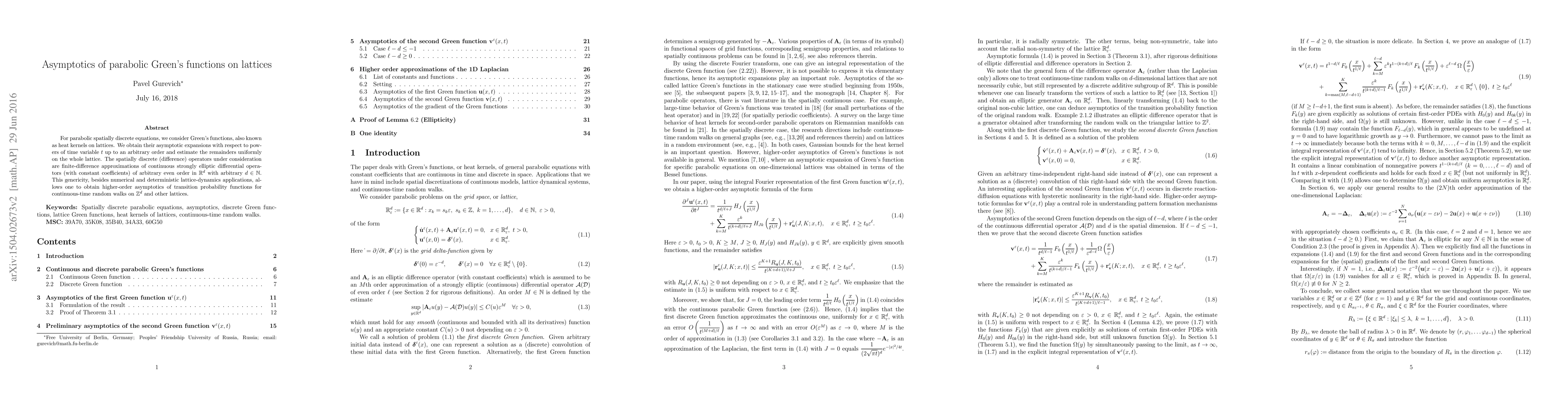 This paper derives asymptotic expansions for parabolic Green's functions on lattices, providing uniform estimates for the remainders up to any order in time. The study applies to finite-difference approximations of continuous elliptic operators, extending to higher-order asymptotics for transition probability functions in continuous-time random walks.