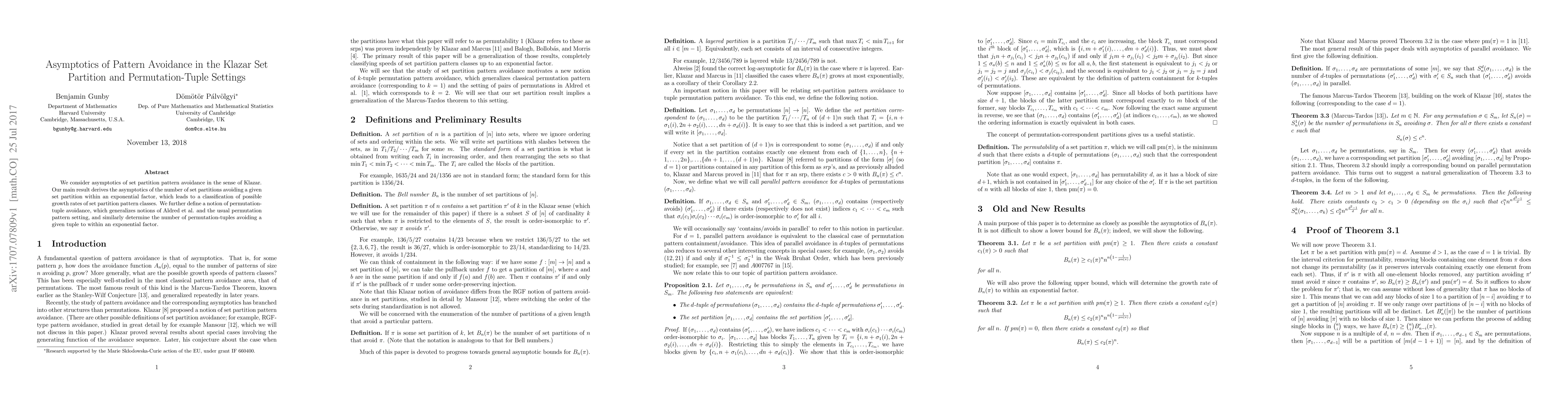 This paper investigates the asymptotic behavior of pattern avoidance in Klazar's set partition and permutation-tuple settings, deriving the growth rates of set partition pattern classes and determining the number of permutation-tuples that avoid given patterns within an exponential factor.