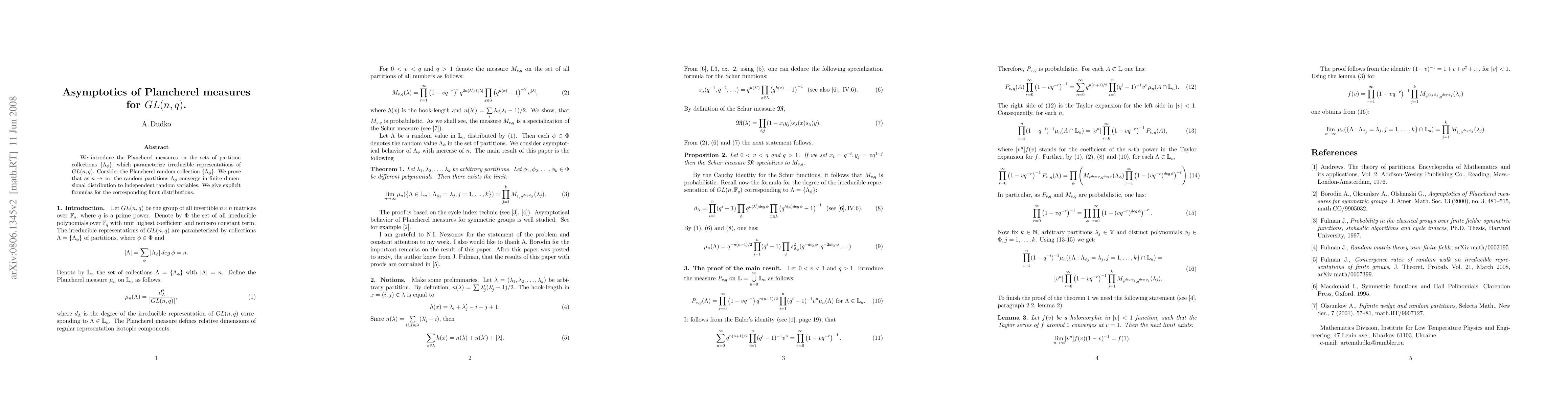 We introduce the Plancherel measure on the set of partition collections, which parameterize irreducible representations of order n general linear group over a finite field. We prove that as n goes to infinity, the random partitions from the random collections converge in finite dimencional distribution to independent random variables. We give explicit formulas for the corresponding limit distributions.