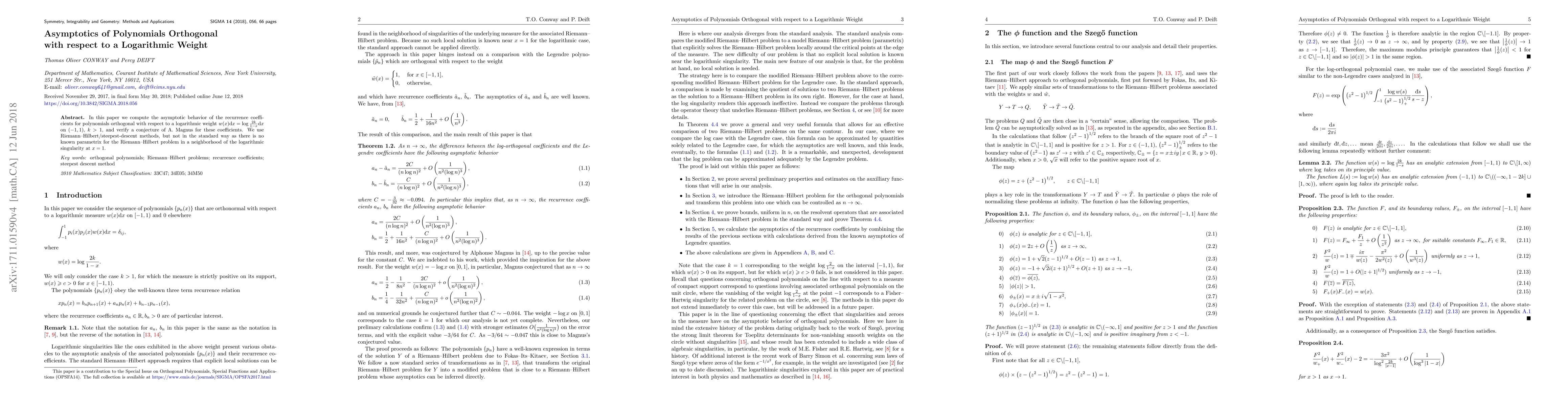 This paper computes the asymptotic behavior of recurrence coefficients for polynomials orthogonal to a logarithmic weight on (-1,1) and verifies a conjecture, using Riemann-Hilbert/steepest-descent methods.