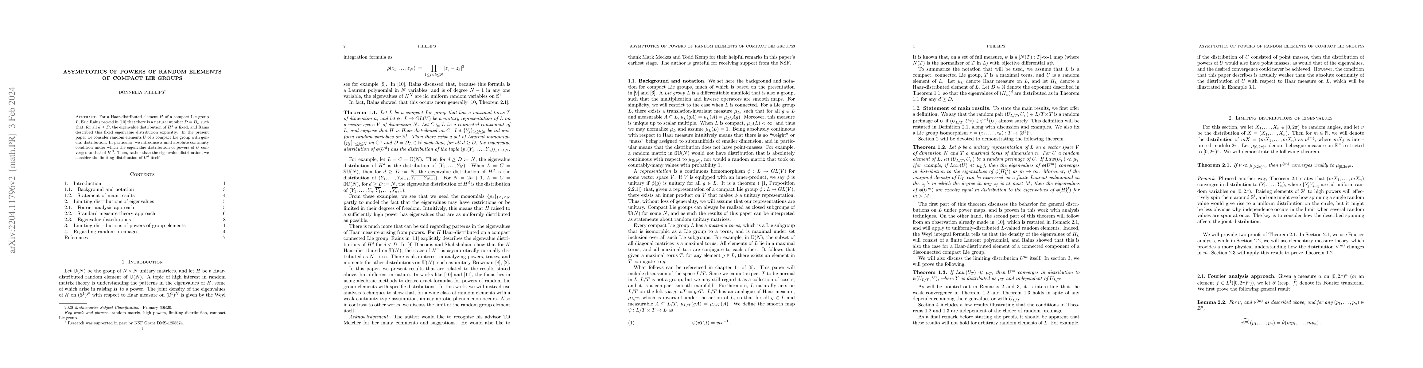 This paper extends the results of Eric Rains on the asymptotic eigenvalue distribution of powers of Haar-distributed elements in compact Lie groups to elements with a general distribution, under a mild absolute continuity condition. It focuses on the limiting distribution of the random element itself rather than just its eigenvalues.