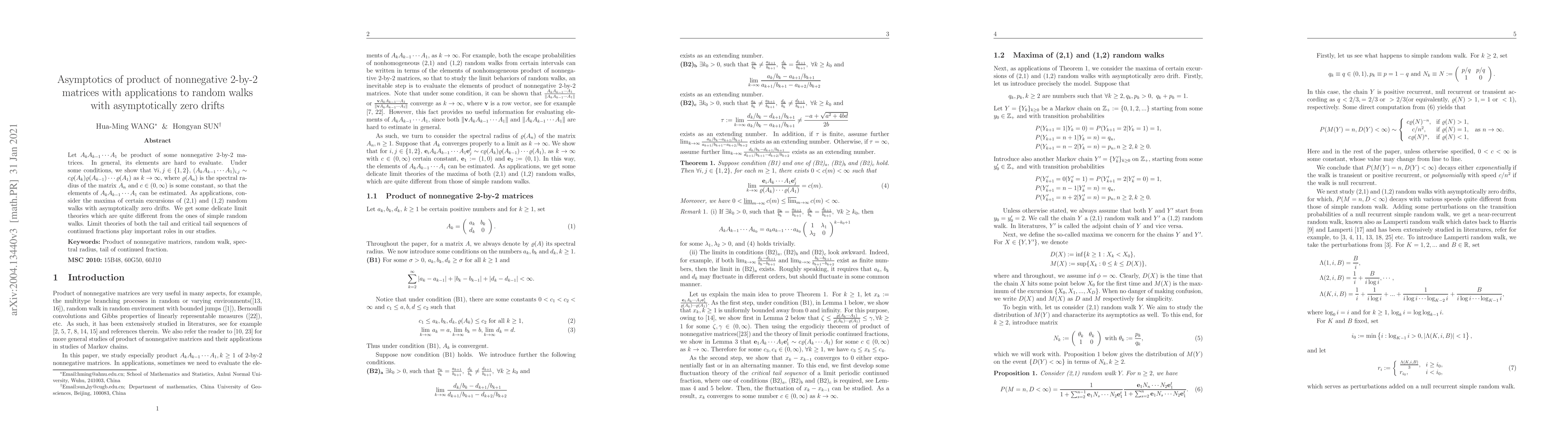 Let $A_kA_{k-1}\cdots A_1$ be product of some nonnegative 2-by-2 matrices. In general, its elements are hard to evaluate. Under some conditions, we show that $\forall i,j\in\{1,2\},$ $(A_kA_{k-1}\cdots A_1)_{i,j}\sim c\varrho(A_k)\varrho(A_{k-1})\cdots \varrho(A_1)$ as $k\rightarrow\infty,$ where $\varrho(A_n)$ is the spectral radius of the matrix $A_n$ and $c\in(0,\infty)$ is some constant, so that the elements of $A_kA_{k-1}\cdots A_1$ can be estimated. As applications, consider the maxima of certain excursions of (2,1) and (1,2) random walks with asymptotically zero drifts. We get some delicate limit theories which are quite different from the ones of simple random walks. Limit theories of both the tail and critical tail sequences of continued fractions play important roles in our studies.
