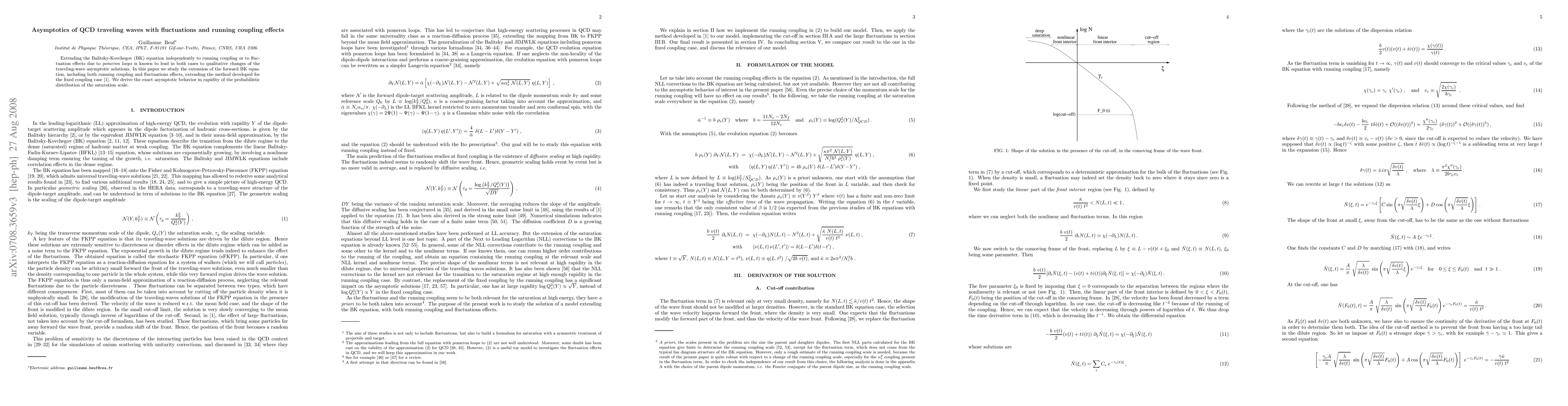 This paper investigates the extended Balitsky-Kovchegov (BK) equation incorporating both running coupling and fluctuation effects, deriving the exact asymptotic behavior of the probabilistic distribution of the saturation scale. The study reveals qualitative changes in traveling-wave solutions compared to the fixed coupling case.