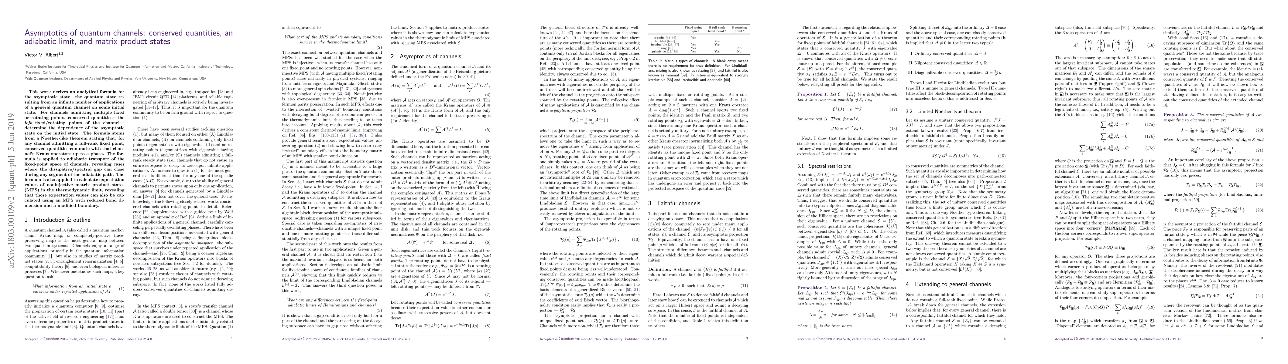 This work derives an analytical formula for the asymptotic state---the quantum state resulting from an infinite number of applications of a general quantum channel on some initial state. For channels admitting multiple fixed or rotating points, conserved quantities---the left fixed/rotating points of the channel---determine the dependence of the asymptotic state on the initial state. The formula stems from a Noether-like theorem stating that, for any channel admitting a full-rank fixed point, conserved quantities commute with that channel's Kraus operators up to a phase. The formula is applied to adiabatic transport of the fixed-point space of channels, revealing cases where the dissipative/spectral gap can close during any segment of the adiabatic path. The formula is also applied to calculate expectation values of noninjective matrix product states (MPS) in the thermodynamic limit, revealing that those expectation values can also be calculated using an MPS with reduced bond dimension and a modified boundary.