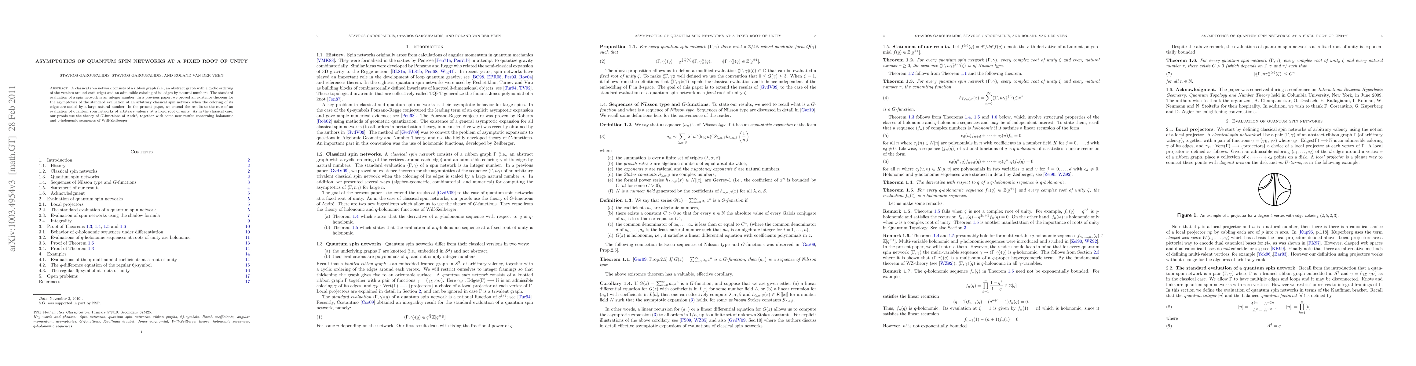 A classical spin network consists of a ribbon graph (i.e., an abstract graph with a cyclic ordering of the vertices around each edge) and an admissible coloring of its edges by natural numbers. The standard evaluation of a spin network is an integer number. In a previous paper, we proved an existence theorem for the asymptotics of the standard evaluation of an arbitrary classical spin network when the coloring of its edges are scaled by a large natural number. In the present paper, we extend the results to the case of an evaluation of quantum spin networks of arbitrary valency at a fixed root of unity. As in the classical case, our proofs use the theory of $G$-functions of Andr\'e, together with some new results concerning holonomic and $q$-holonomic sequences of Wilf-Zeilberger.