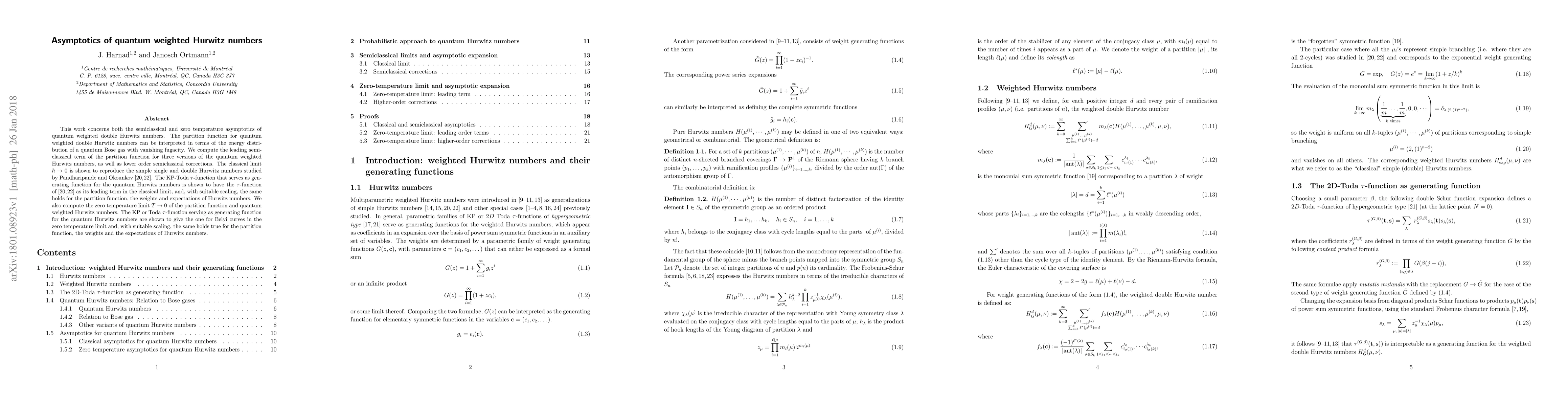 This work concerns both the semiclassical and zero temperature asymptotics of quantum weighted double Hurwitz numbers. The partition function for quantum weighted double Hurwitz numbers can be interpreted in terms of the energy distri- bution of a quantum Bose gas with vanishing fugacity. We compute the leading semi- classical term of the partition function for three versions of the quantum weighted Hurwitz numbers, as well as lower order semiclassical corrections. The classical limit $\hbar \ra 0$ is shown to reproduce the simple single and double Hurwitz numbers studied by Pandharipande and Okounkov [20,22]. The KP-Toda $\tau$-function that serves as generating function for the quantum Hurwitz numbers is shown to have the $\tau$-function of [20,22] as its leading term in the classical limit, and, with suitable scaling, the same holds for the partition function, the weights and expectations of Hurwitz numbers. We also compute the zero temperature limit $T \ra 0$ of the partition function and quantum weighted Hurwitz numbers. The KP or Toda $\tau$-function serving as generating function for the quantum Hurwitz numbers are shown to give the one for Belyi curves in the zero temperature limit and, with suitable scaling, the same holds true for the partition function, the weights and the expectations of Hurwitz numbers.