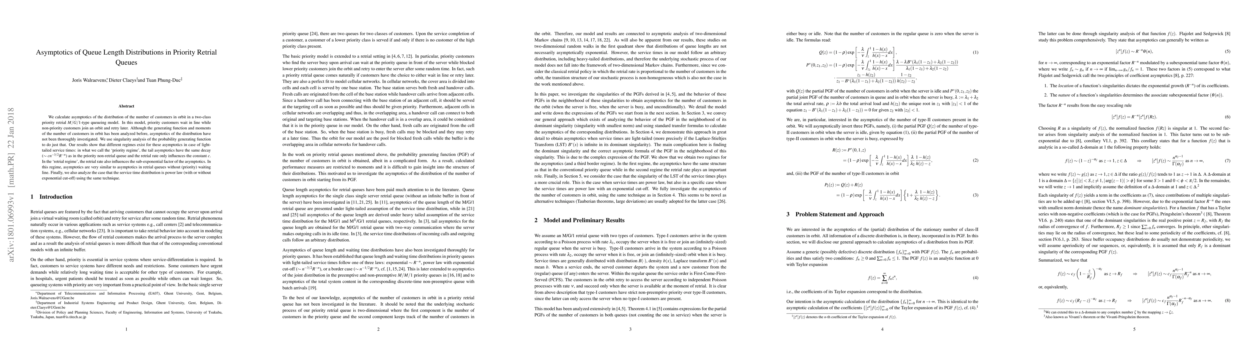 This paper investigates the asymptotic behavior of queue length distributions in a two-class priority retrial queue, employing singularity analysis of the probability generating function. It reveals distinct regimes: in the "priority regime," the tail decay mirrors that of priority non-retrial queues, while in the "retrial regime," the retrial rate affects the sub-exponential factor, resembling non-priority retrial queues.