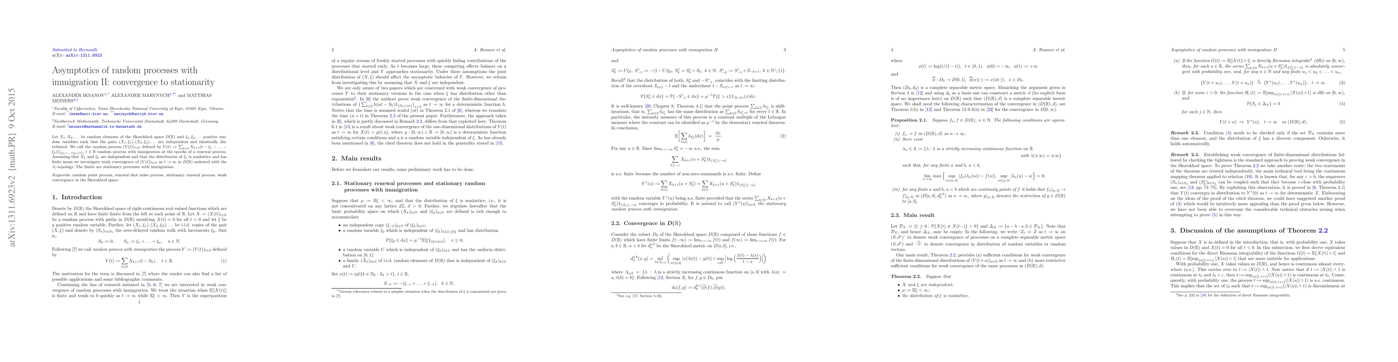 Let $X_1, X_2,\ldots$ be random elements of the Skorokhod space $D(\mathbb{R})$ and $\xi_1, \xi_2, \ldots$ positive random variables such that the pairs $(X_1,\xi_1), (X_2,\xi_2),\ldots$ are independent and identically distributed. We call the random process $(Y(t))_{t \in \mathbb{R}}$ defined by $Y(t):=\sum_{k \geq 0}X_{k+1}(t-\xi_1-\ldots-\xi_k)1_{\{\xi_1+\ldots+\xi_k\leq t\}}$, $t\in\mathbb{R}$ random process with immigration at the epochs of a renewal process. Assuming that $X_k$ and $\xi_k$ are independent and that the distribution of $\xi_1$ is nonlattice and has finite mean we investigate weak convergence of $(Y(t))_{t\in\mathbb{R}}$ as $t\to\infty$ in $D(\mathbb{R})$ endowed with the $J_1$-topology. The limits are stationary processes with immigration.
