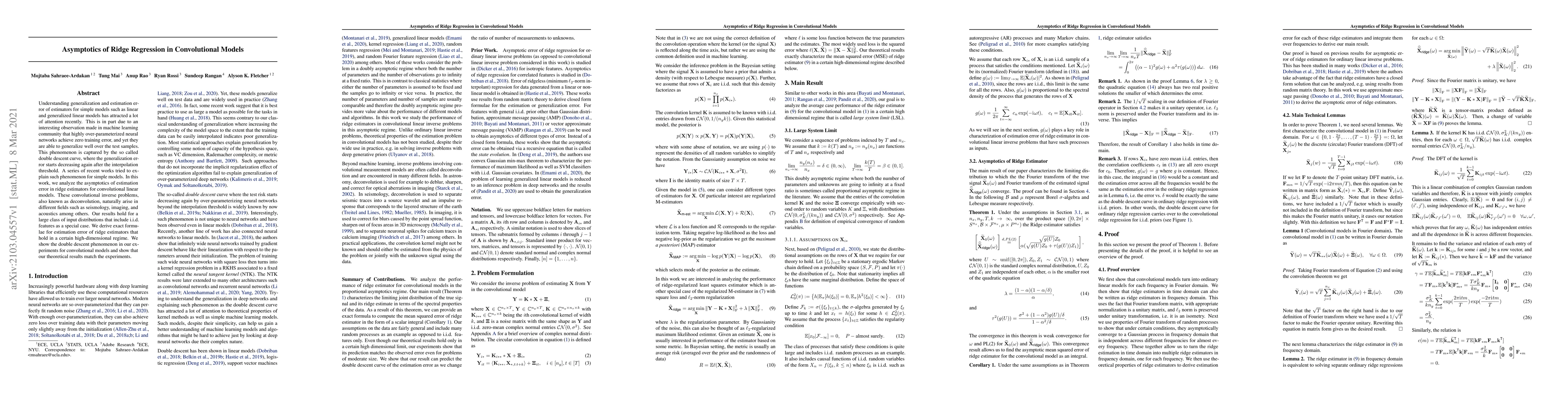 This paper analyzes the asymptotics of ridge regression in convolutional models, finding that they exhibit a double descent curve where generalization error decreases after an interpolation threshold, with theoretical results matching experimental findings.