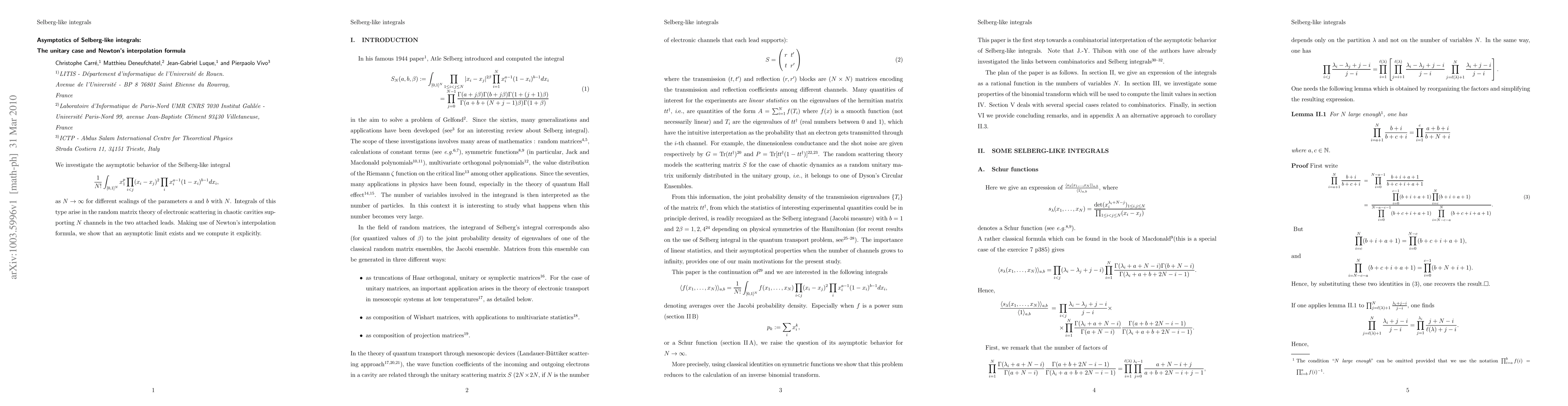 This paper explores the asymptotic behavior of Selberg-like integrals as N approaches infinity, specifically for unitary cases. Utilizing Newton's interpolation formula, it demonstrates the existence of an asymptotic limit and provides an explicit computation for it. These integrals are significant in random matrix theory, modeling electronic scattering in chaotic cavities with N channels.