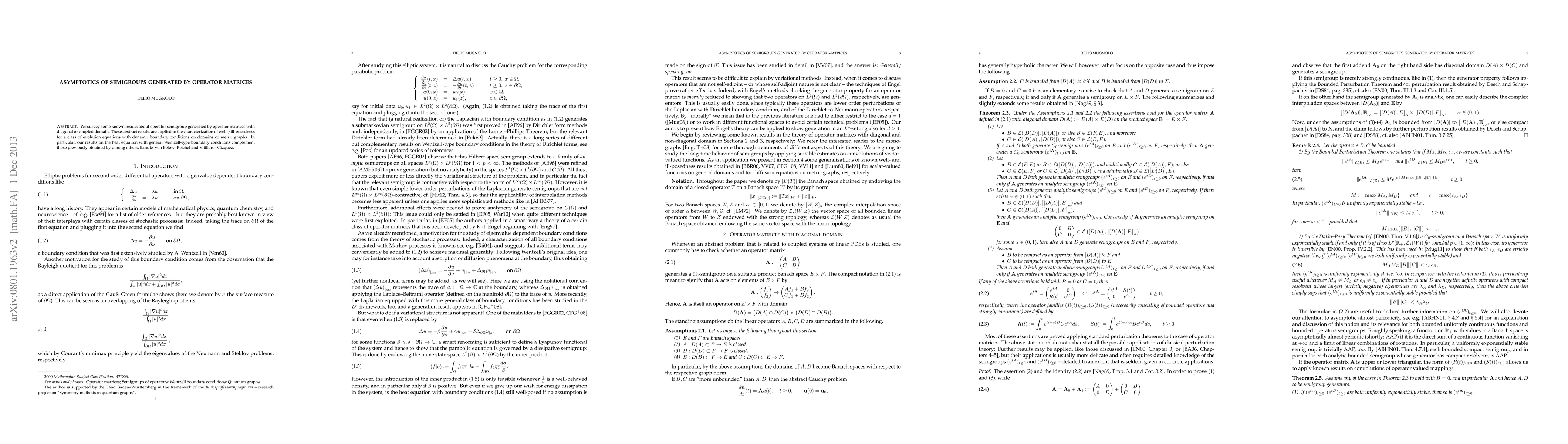 This paper surveys results on operator semigroups generated by operator matrices, focusing on their asymptotic behavior. It applies these findings to characterize the well-/ill-posedness of evolution equations with dynamic boundary conditions, notably complementing previous work on the heat equation with Wentzell-type boundary conditions.