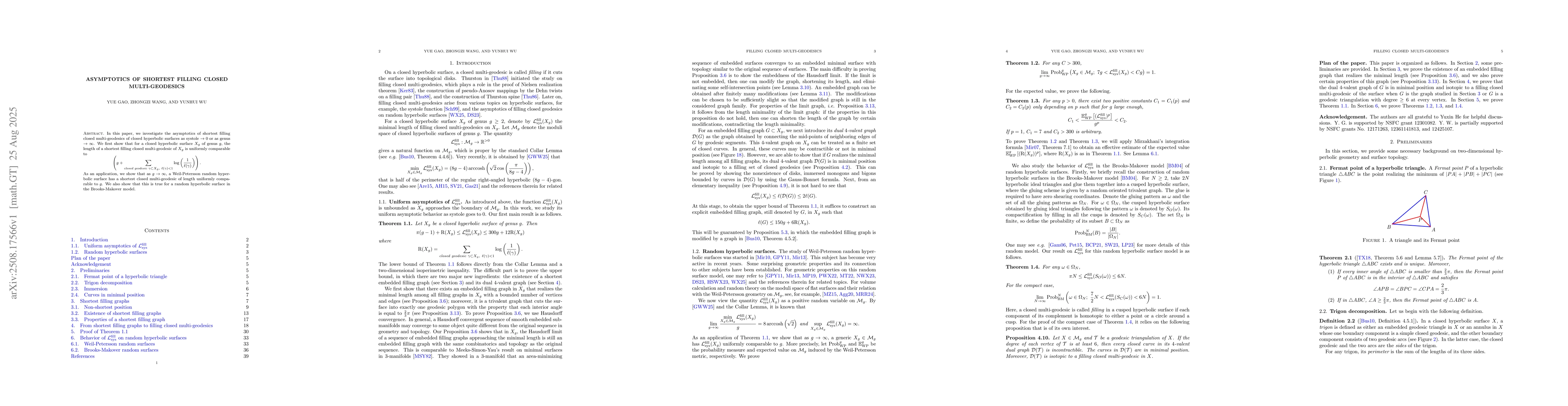 In this paper, we investigate the asymptotics of shortest filling closed multi-geodesics of closed hyperbolic surfaces as systole $\to 0$ or as genus $\to \infty$. We first show that for a closed hyperbolic surface $X_g$ of genus $g$, the length of a shortest filling closed multi-geodesic of $X_g$ is uniformly comparable to $$\left(g+\sum\limits_{\textit{closed geodesic }\gamma\subset X_g, \ \ell(\gamma)<1}\log \left(\frac{1}{\ell(\gamma)}\right)\right).$$ As an application, we show that as $g\to \infty$, a Weil-Petersson random hyperbolic surface has a shortest closed multi-geodesic of length uniformly comparable to $g$. We also show that this is true for a random hyperbolic surface in the Brooks-Makover model.