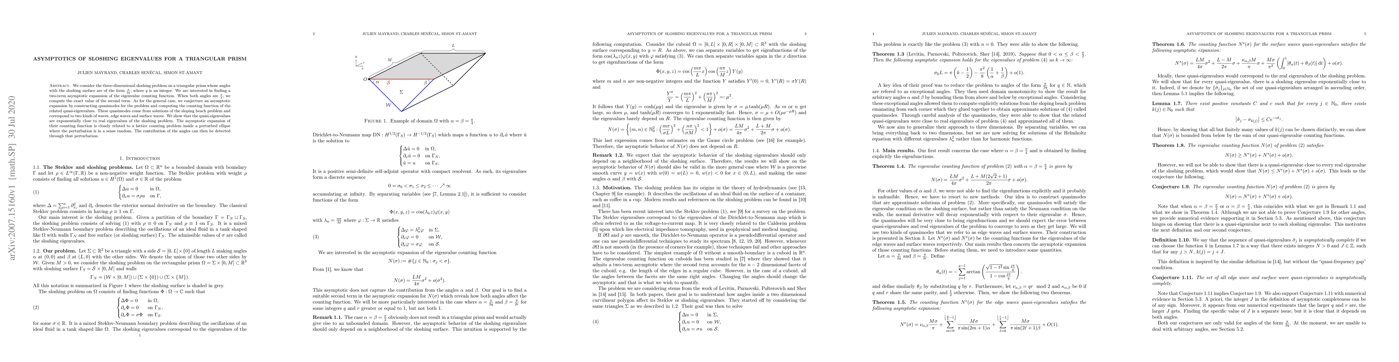 Researchers studied sloshing on a triangular prism with varying angles, finding an asymptotic expansion of eigenvalue counting functions related to quasimodes from the sloping beach problem, which helps detect the effect of these angles.