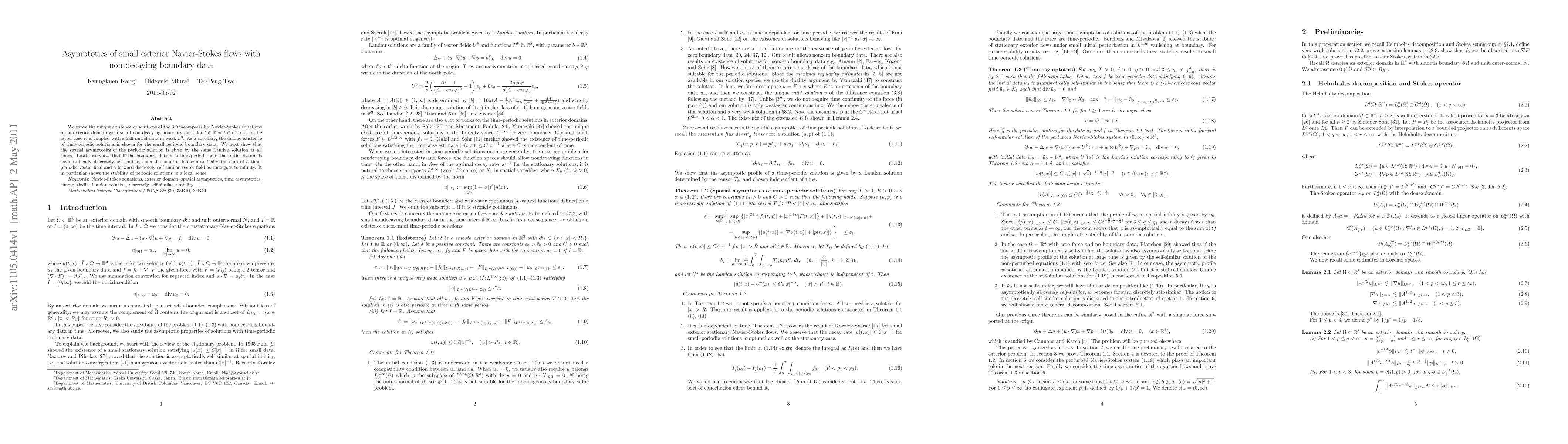 This paper proves the unique existence of solutions to the 3D incompressible Navier-Stokes equations in exterior domains with small non-decaying boundary data. It also demonstrates the stability of periodic solutions and shows that the spatial asymptotics of periodic solutions follow the Landau solution.