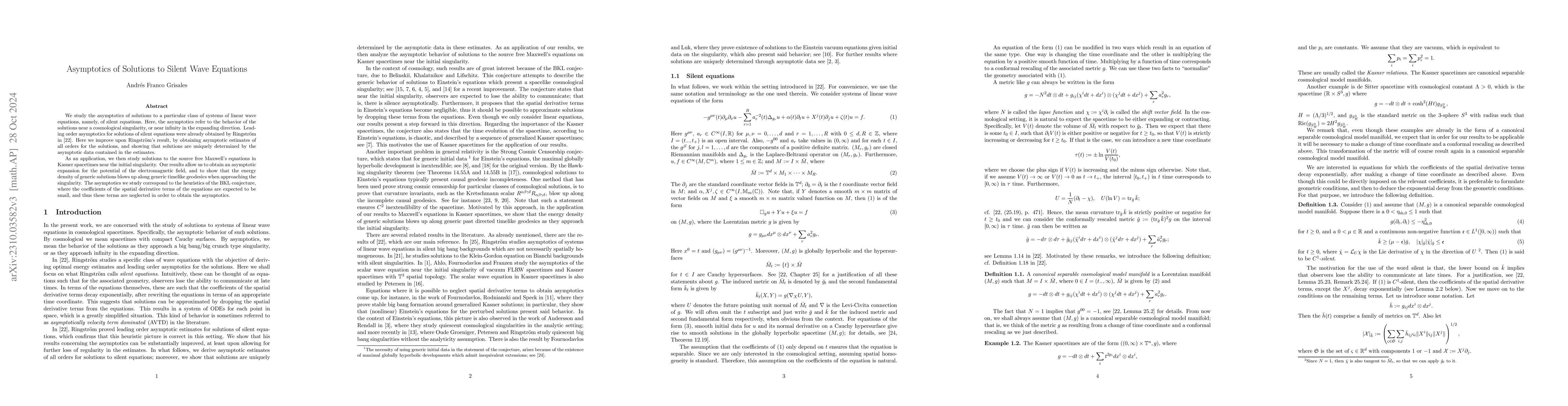 This paper investigates the asymptotic behavior of solutions to silent wave equations, deriving high-order estimates and demonstrating their uniqueness. It applies these findings to source-free Maxwell's equations in Kasner spacetimes, revealing an asymptotic expansion for electromagnetic potentials and showing energy density divergence near singularities.