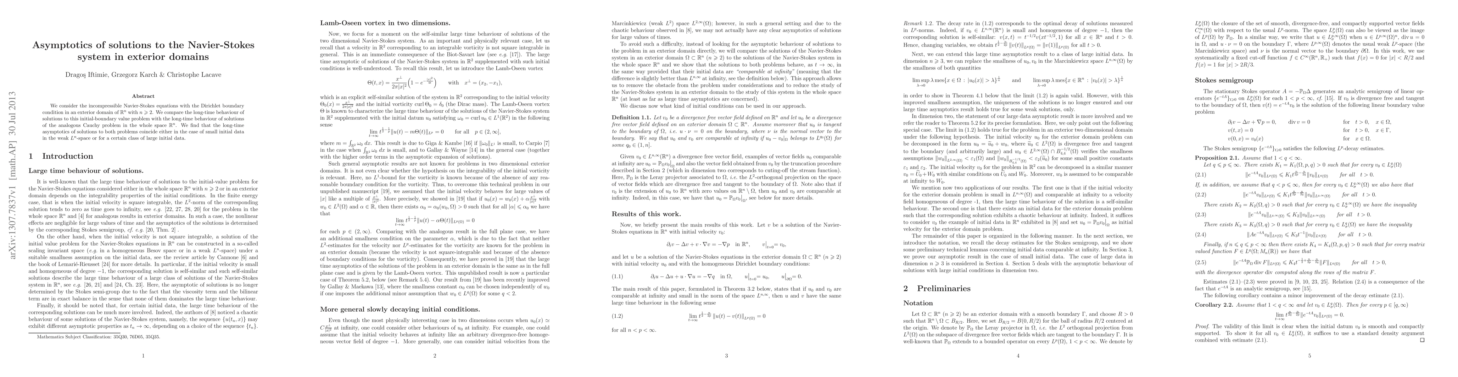This paper investigates the asymptotic behavior of solutions to the incompressible Navier-Stokes equations in exterior domains, comparing it to solutions in whole space. The study finds that the long-time asymptotics match for small initial data in the weak $L^n$-space or for a specific class of large initial data.
