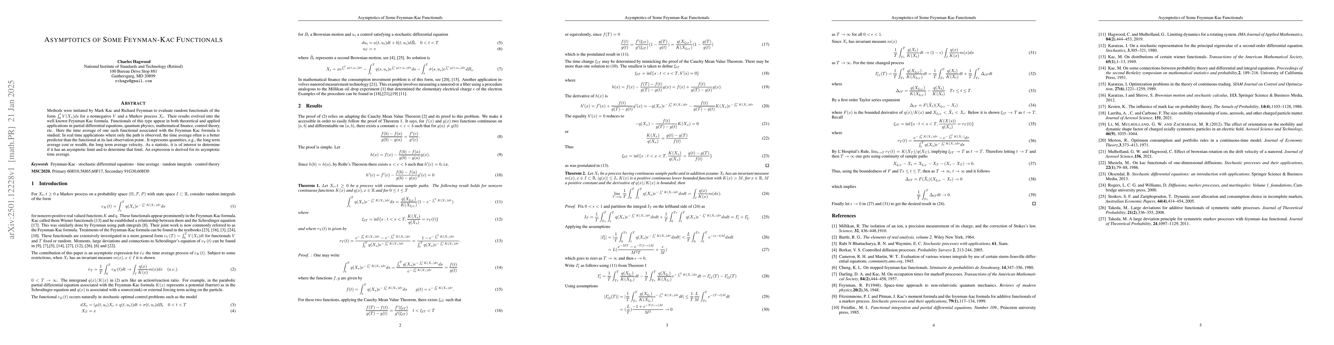 This paper investigates the time average of Feynman-Kac functionals, deriving an expression for its asymptotic limit in real-time applications. It examines the long-term average cost or wealth and determines whether it converges and what that limit is.