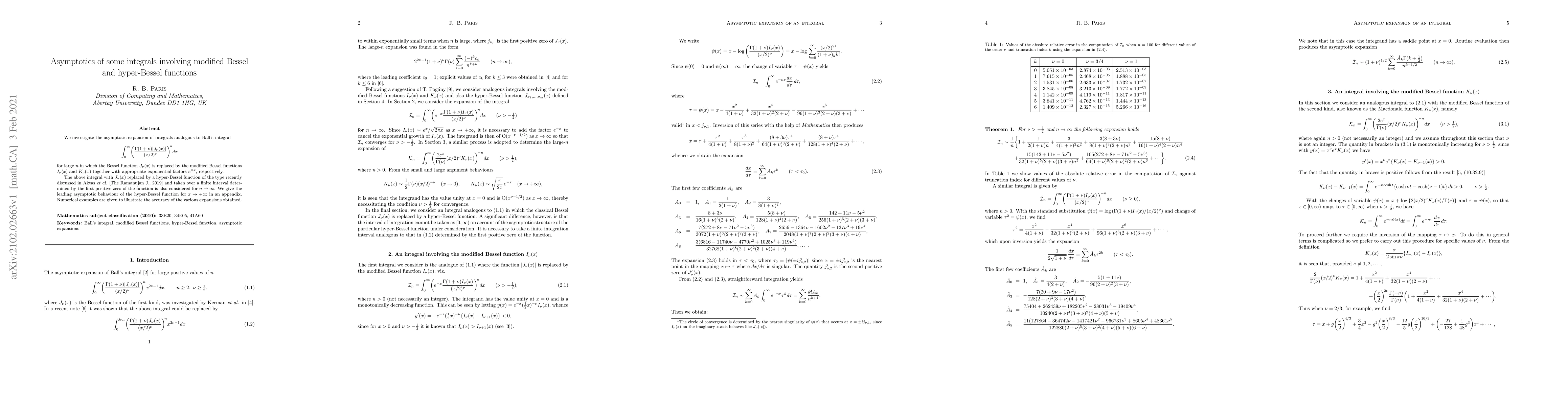 This paper examines the asymptotic expansion of integrals involving modified Bessel functions $I_\nu(x)$ and $K_\nu(x)$ with exponential factors and hyper-Bessel functions for large $n$. It provides leading asymptotic behaviors and validates the results with numerical examples.