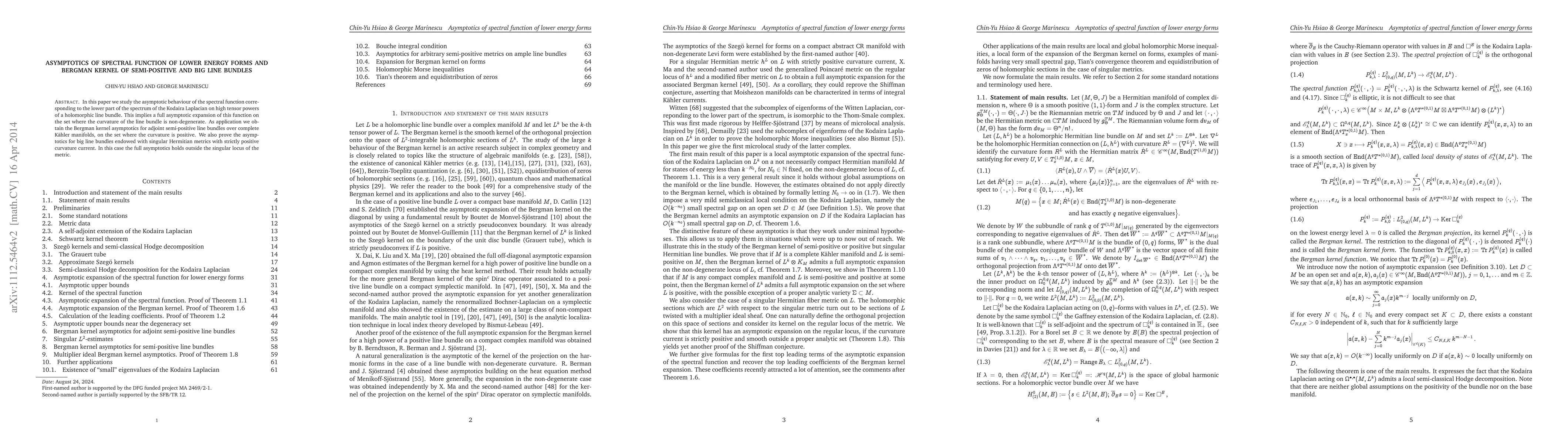 In this paper we study the asymptotic behaviour of the spectral function corresponding to the lower part of the spectrum of the Kodaira Laplacian on high tensor powers of a holomorphic line bundle. This implies a full asymptotic expansion of this function on the set where the curvature of the line bundle is non-degenerate. As application we obtain the Bergman kernel asymptotics for adjoint semi-positive line bundles over complete Kaehler manifolds, on the set where the curvature is positive. We also prove the asymptotics for big line bundles endowed with singular Hermitian metrics with strictly positive curvature current. In this case the full asymptotics holds outside the singular locus of the metric.