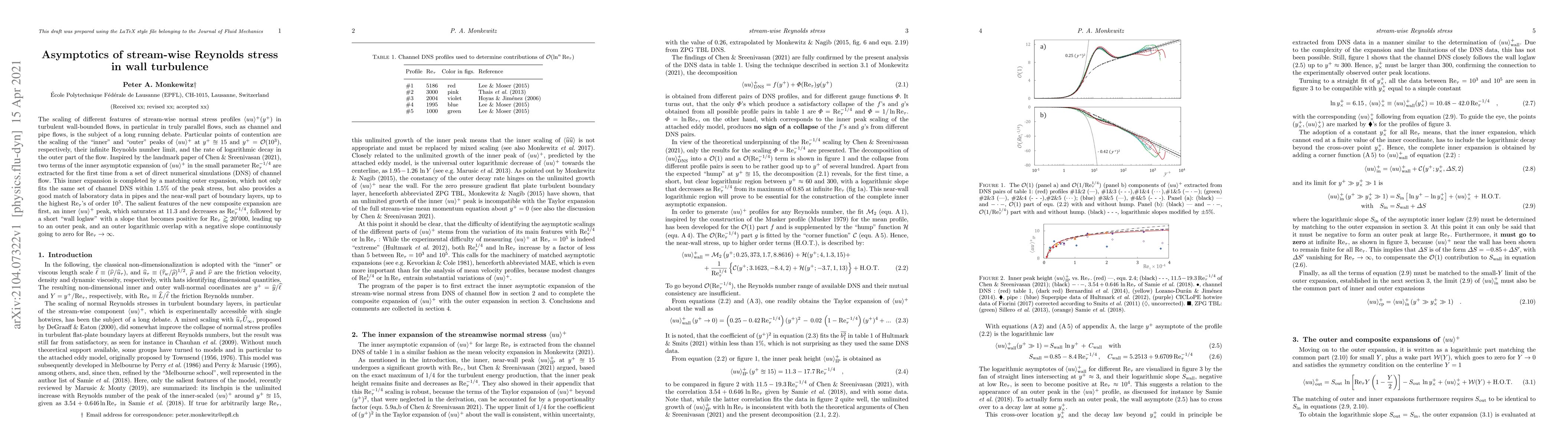 This paper presents a new composite asymptotic expansion for the stream-wise Reynolds stress in turbulent wall-bounded flows, derived from direct numerical simulations and matching laboratory data. It reveals an inner peak that saturates and decreases with Reynolds number, followed by a wall loglaw and an outer logarithmic region.