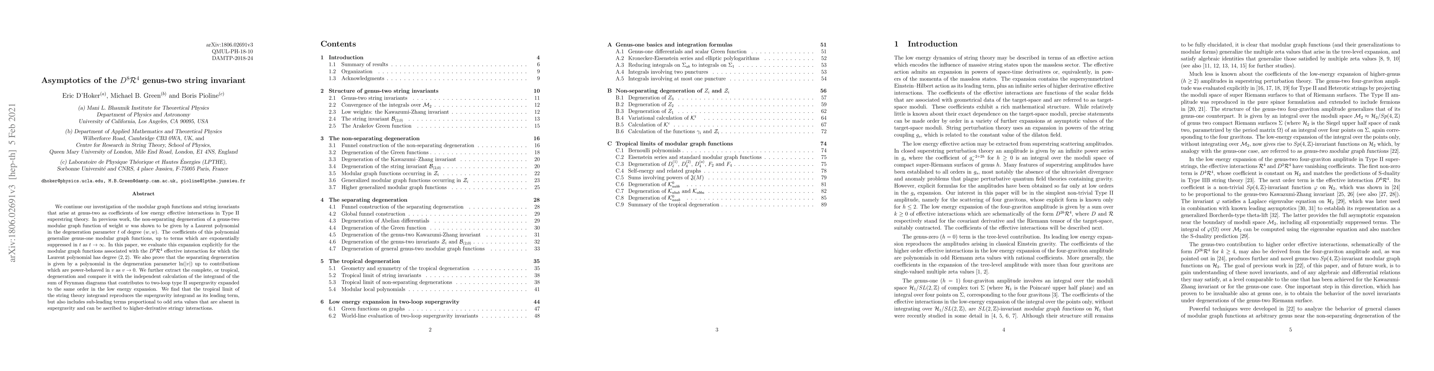 We continue our investigation of the modular graph functions and string invariants that arise at genus-two as coefficients of low energy effective interactions in Type II superstring theory. In previous work, the non-separating degeneration of a genus-two modular graph function of weight $w$ was shown to be given by a Laurent polynomial in the degeneration parameter $t$ of degree $(w,w)$. The coefficients of this polynomial generalize genus-one modular graph functions, up to terms which are exponentially suppressed in $t$ as $t \to \infty$. In this paper, we evaluate this expansion explicitly for the modular graph functions associated with the $D^8 {\cal R}^4$ effective interaction for which the Laurent polynomial has degree $(2,2)$. We also prove that the separating degeneration is given by a polynomial in the degeneration parameter $\ln (|v|)$ up to contributions which are power-behaved in $v$ as $v \to 0$. We further extract the complete, or tropical, degeneration and compare it with the independent calculation of the integrand of the sum of Feynman diagrams that contributes to two-loop type II supergravity expanded to the same order in the low energy expansion. We find that the tropical limit of the string theory integrand reproduces the supergravity integrand as its leading term, but also includes sub-leading terms proportional to odd zeta values that are absent in supergravity and can be ascribed to higher-derivative stringy interactions.