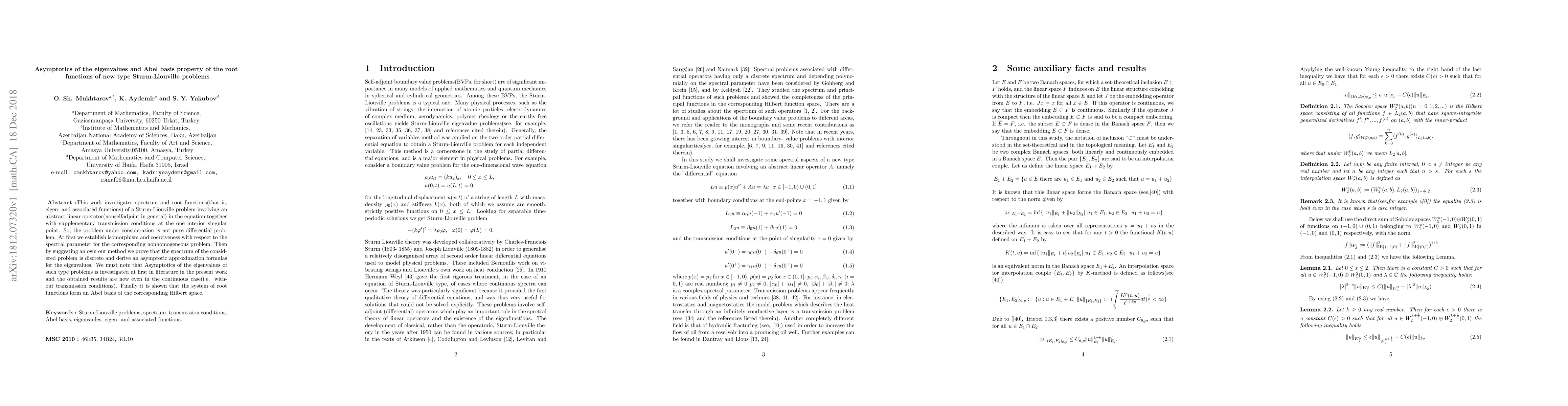 This research paper investigates asymptotics of eigenvalues and Abel basis property for root functions of a new type Sturm-Liouville problem with abstract linear operators and transmission conditions, providing new results in the continuous case.
