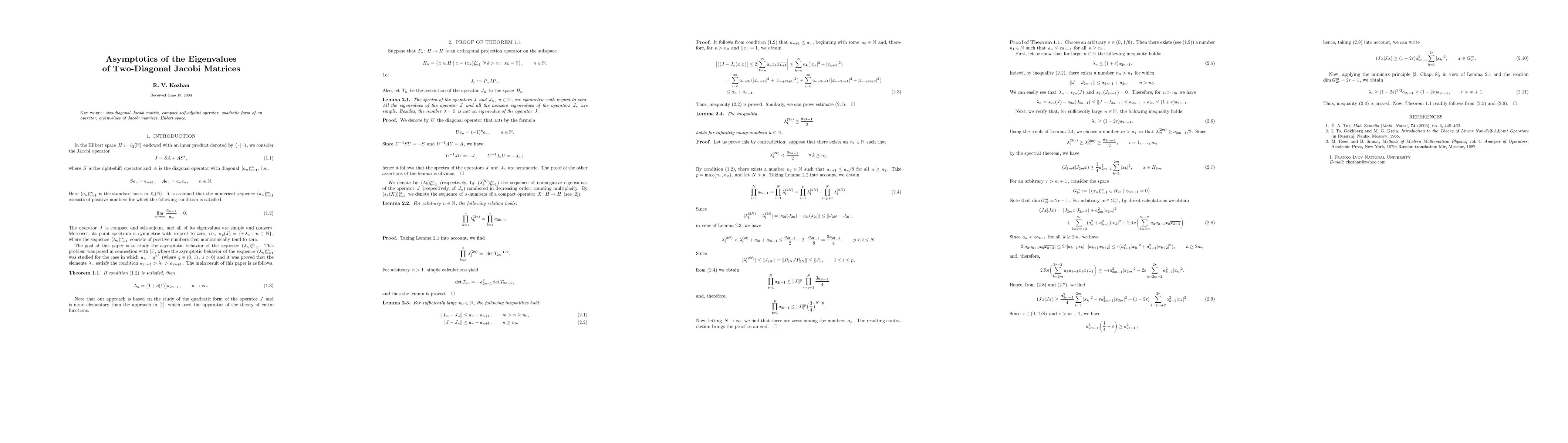 Summary: This paper investigates the asymptotic behavior of eigenvalues in two-diagonal Jacobi matrices where the main diagonal elements are zero, and the off-diagonal elements tend to zero, providing a detailed analysis of their limiting distribution.