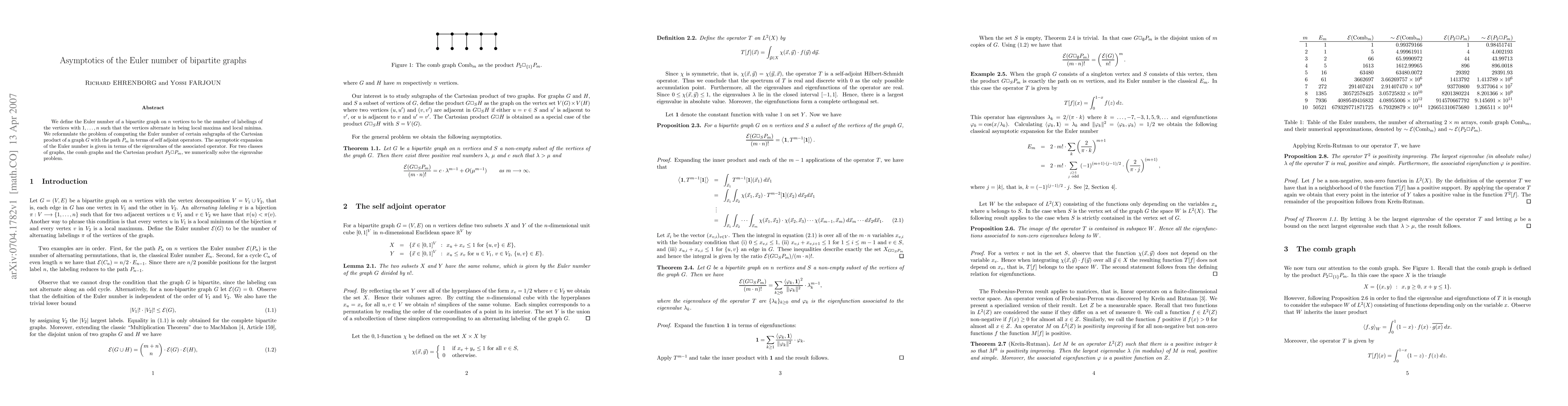 This paper defines the Euler number of bipartite graphs as the count of vertex labelings alternating in local maxima and minima, and provides an asymptotic expansion for it in terms of the eigenvalues of associated self-adjoint operators. Numerical solutions for eigenvalue problems are presented for comb graphs and Cartesian products of paths.