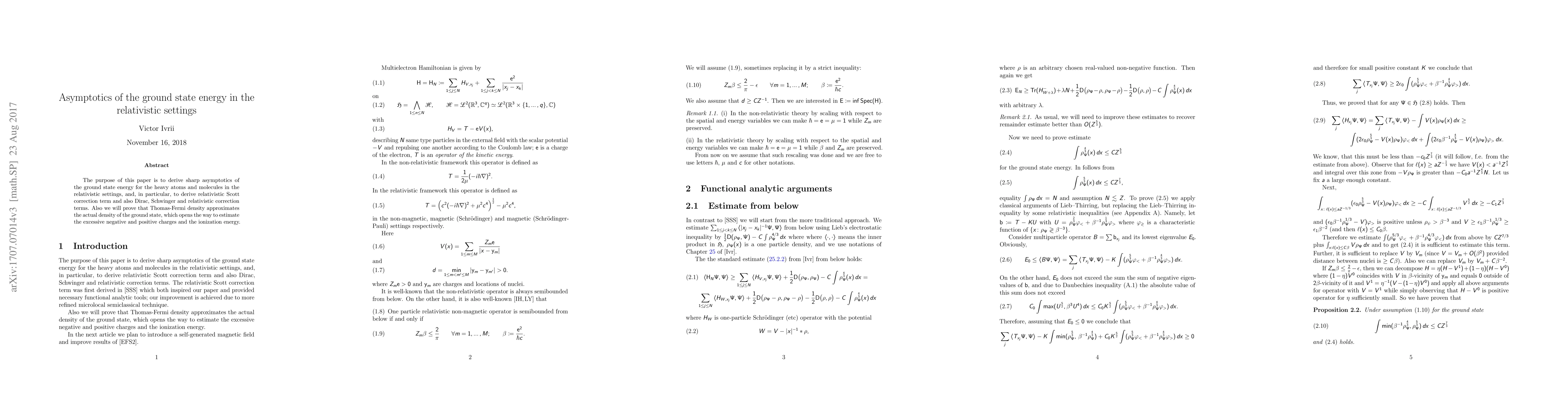 The purpose of this paper is to derive sharp asymptotics of the ground state energy for the heavy atoms and molecules in the relativistic settings, and, in particular, to derive relativistic Scott correction term and also Dirac, Schwinger and relativistic correction terms. Also we will prove that Thomas-Fermi density approximates the actual density of the ground state, which opens the way to estimate the excessive negative and positive charges and the ionization energy.