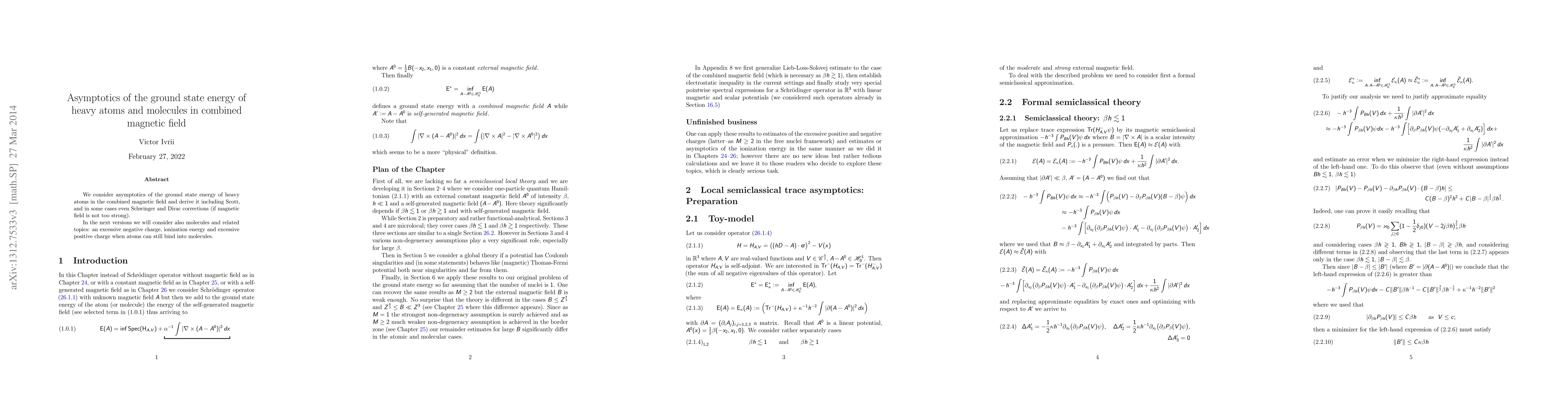 This paper investigates the asymptotic behavior of the ground state energy for heavy atoms in combined magnetic fields, considering both external and self-generated magnetic fields. It derives the expression for the ground state energy and studies its asymptotics, including corrections, under the assumption that the atomic number is relatively small. Future work will extend these findings to molecules and related phenomena.
